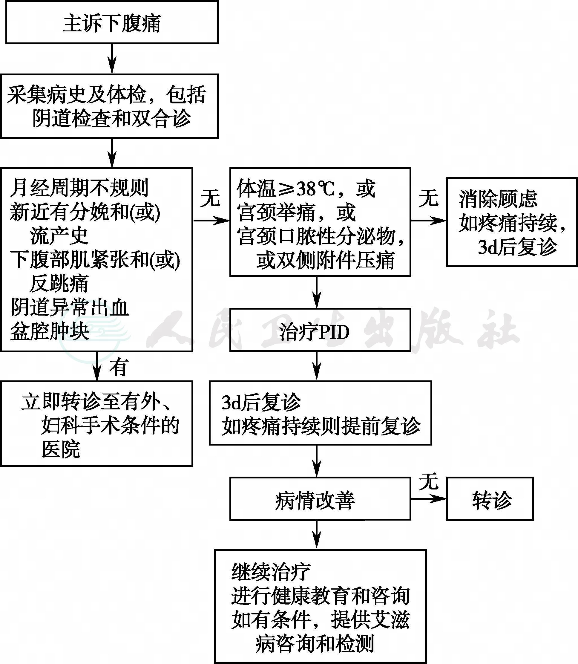 下腹痛是PID的主要症状,包括:下腹痛疼、性交痛、痛经,其体征包括:下腹触痛、肌紧张、反跳痛,宫颈举痛,宫颈分泌物异常、出血,发热等。但是,目前我国的医疗资源不平衡,许多基层医院无法对急性PID进行病因学诊断及必要的实验室检查,使PID不能得到及时的诊疗。为了更好地对PID进行诊治,避免上生殖道感染后遗症的发生,保证妇女健康,针对女性下腹痛的处理原则具有实用价值。但在临床应用时,尤其是对急性下腹痛,首先应该排除外科或妇产科其他急症后,方可给予抗生素治疗。女性下腹痛病症处理流程,见图1。