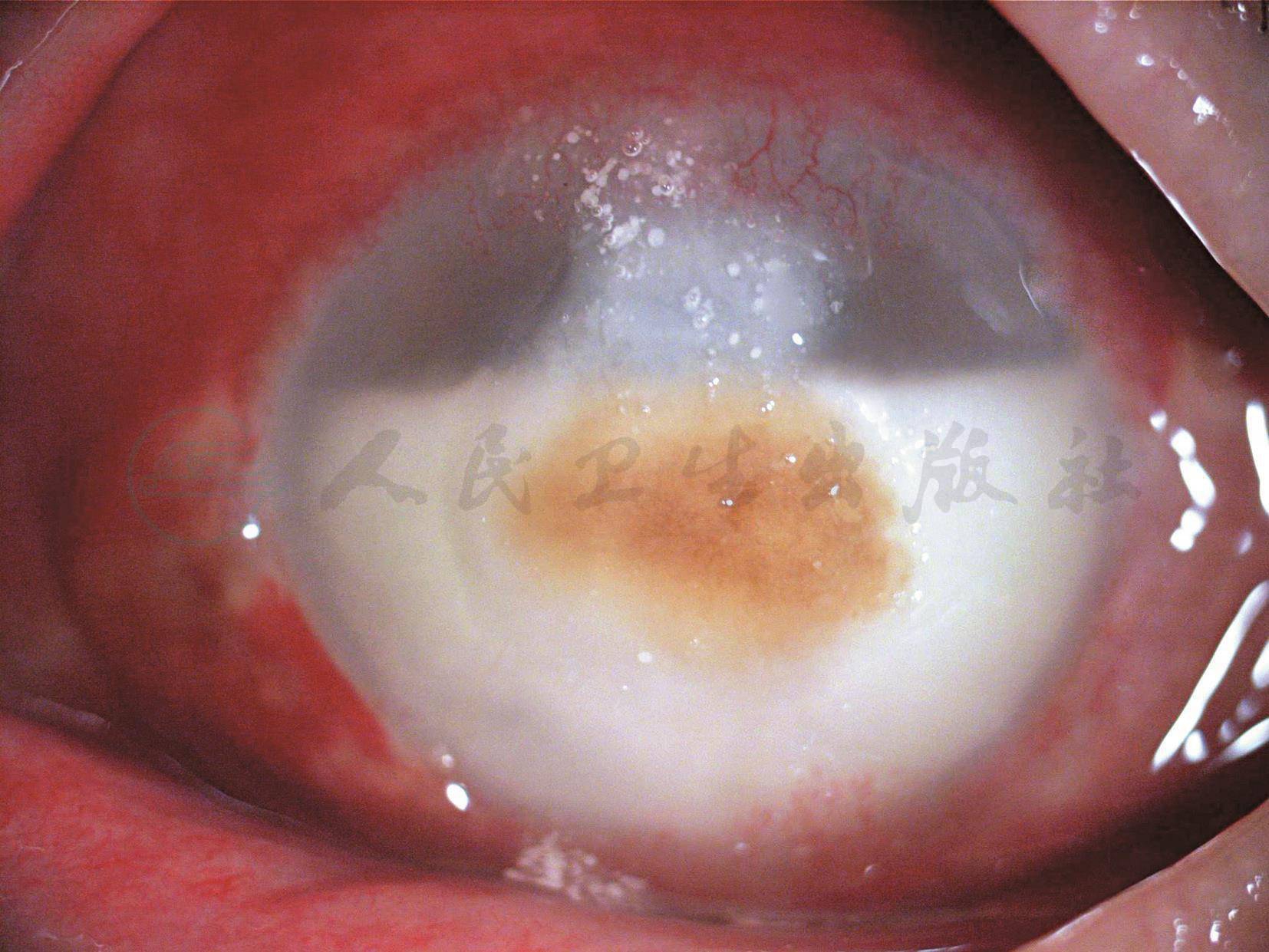 (3)多数菌株引起的角膜溃疡形成缓慢,前房反应轻(但也应注意,有少数菌株可迅速导致角膜深基质脓疡,甚至导致角膜穿孔)(图2-5-2)。