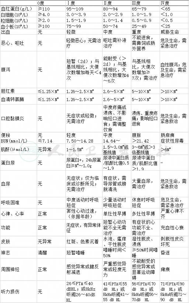 表2.化疗药物(血液、胃肠肝、肾肺心、脑、神经、听力)毒性反应分级标准