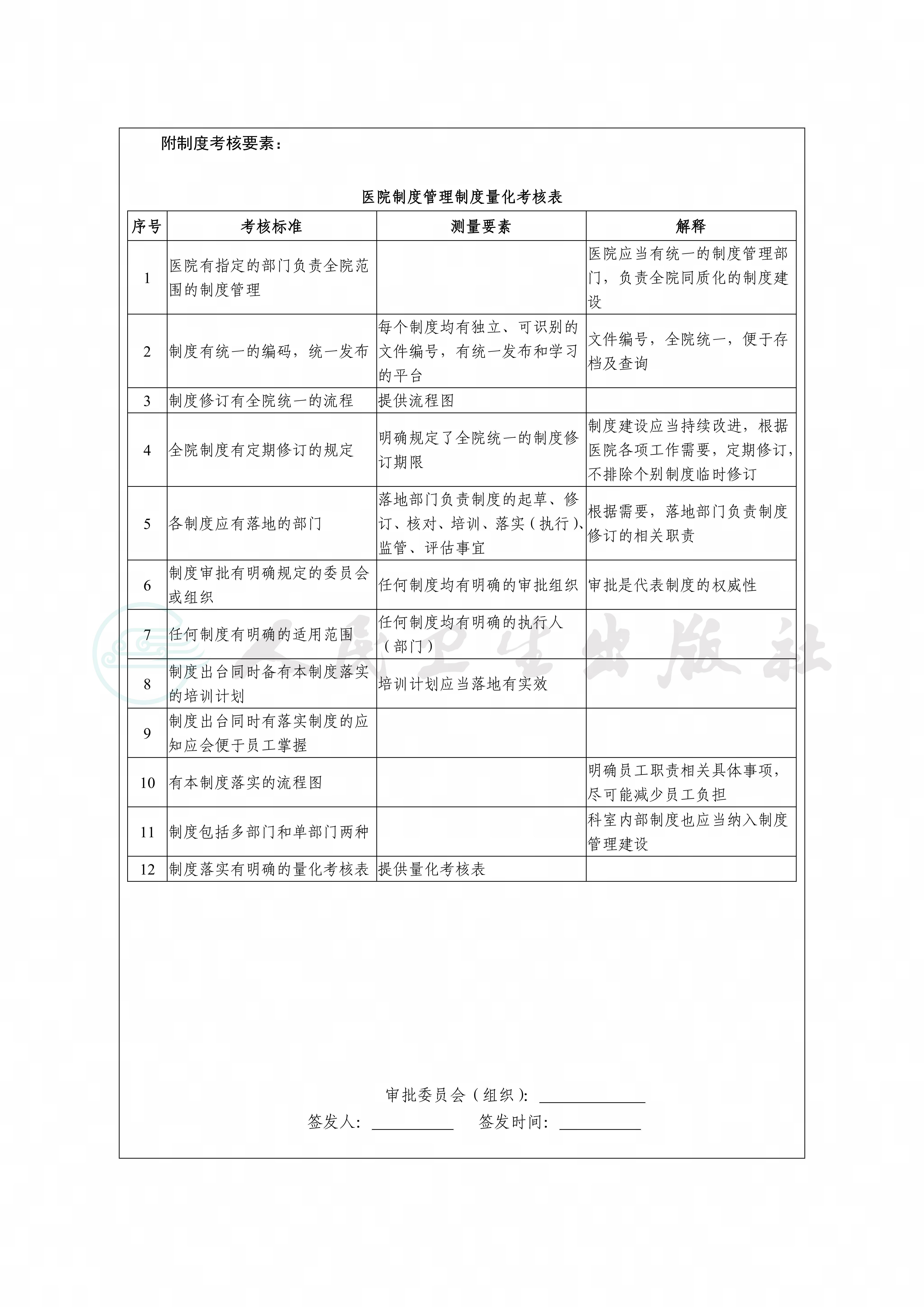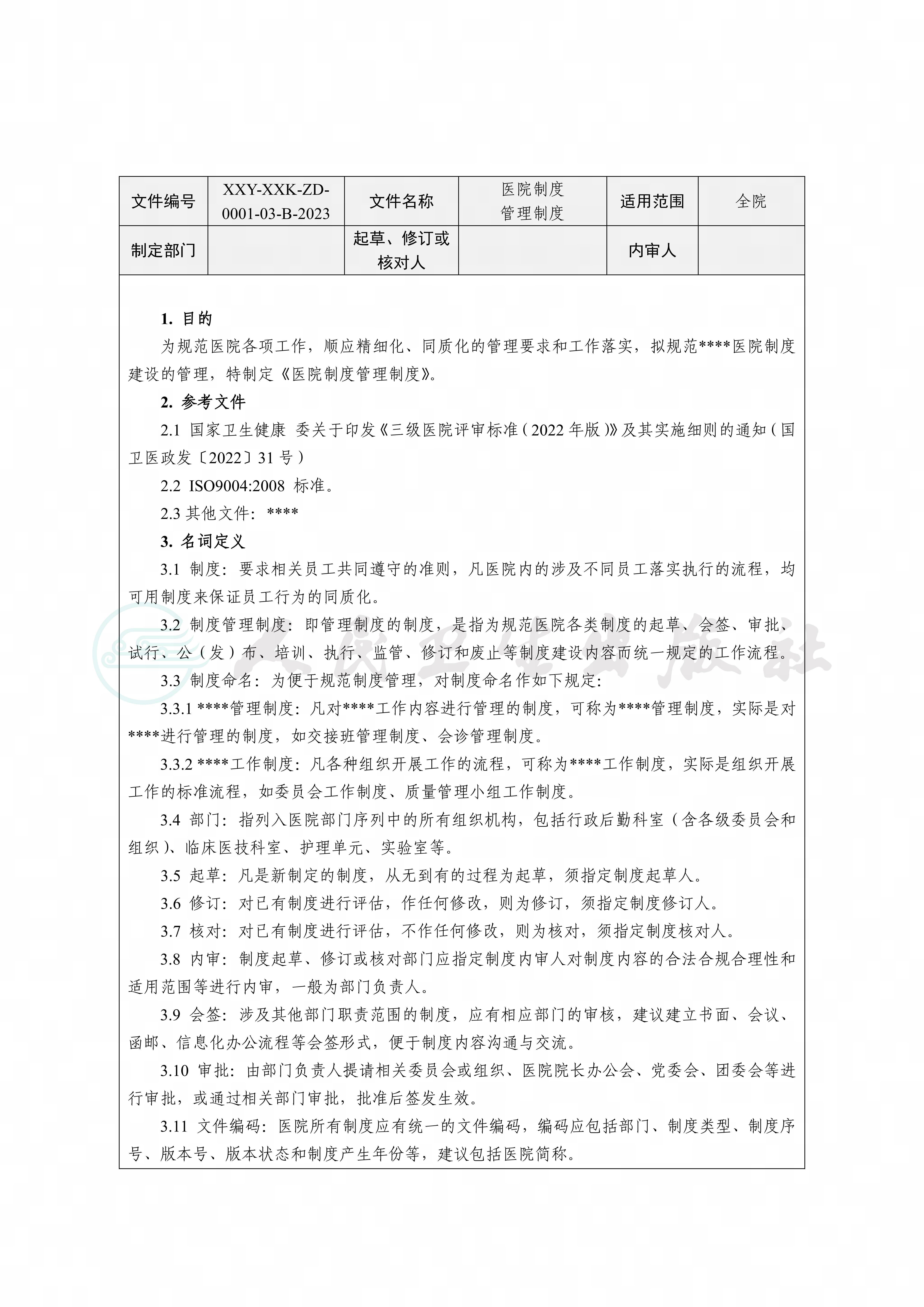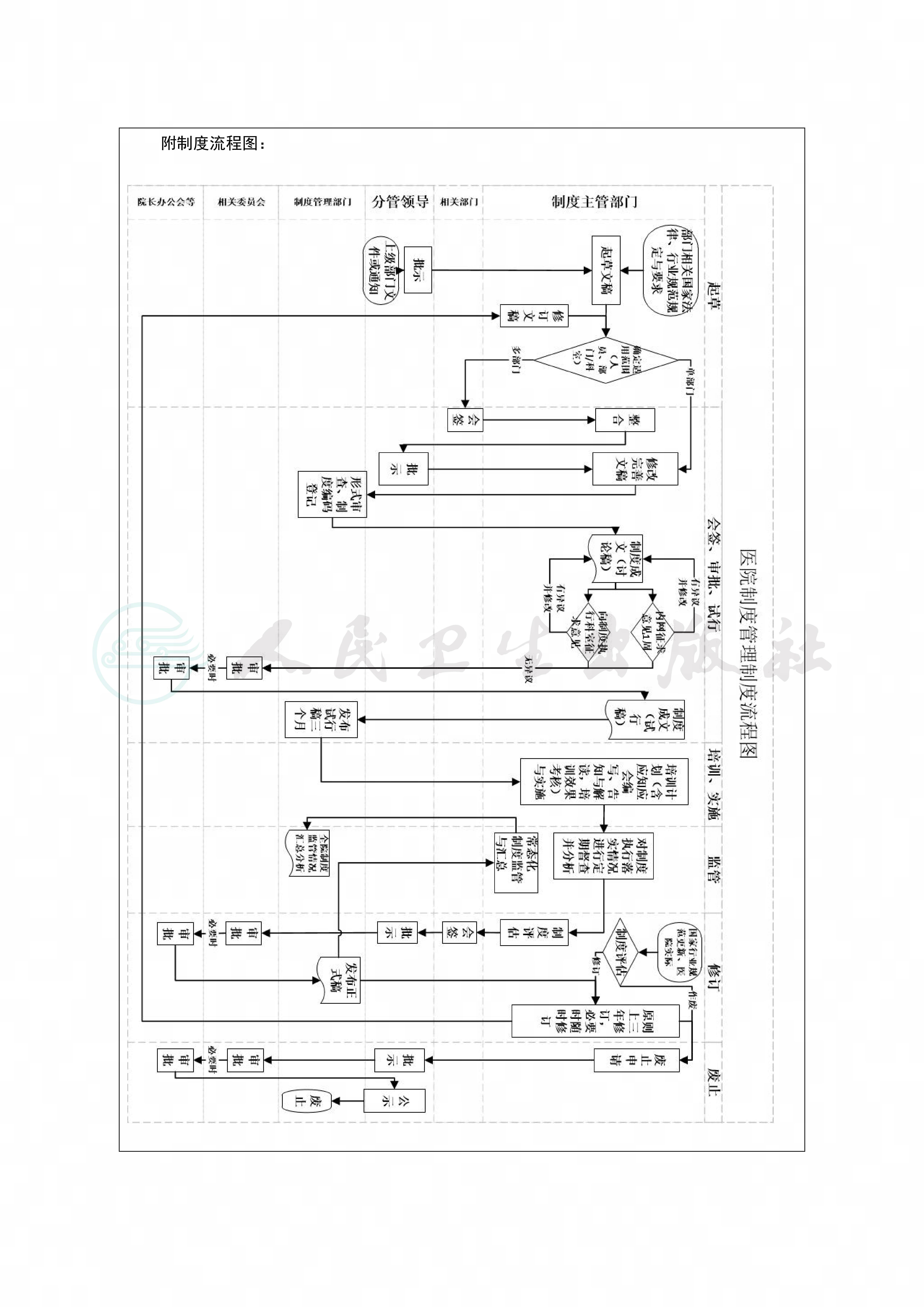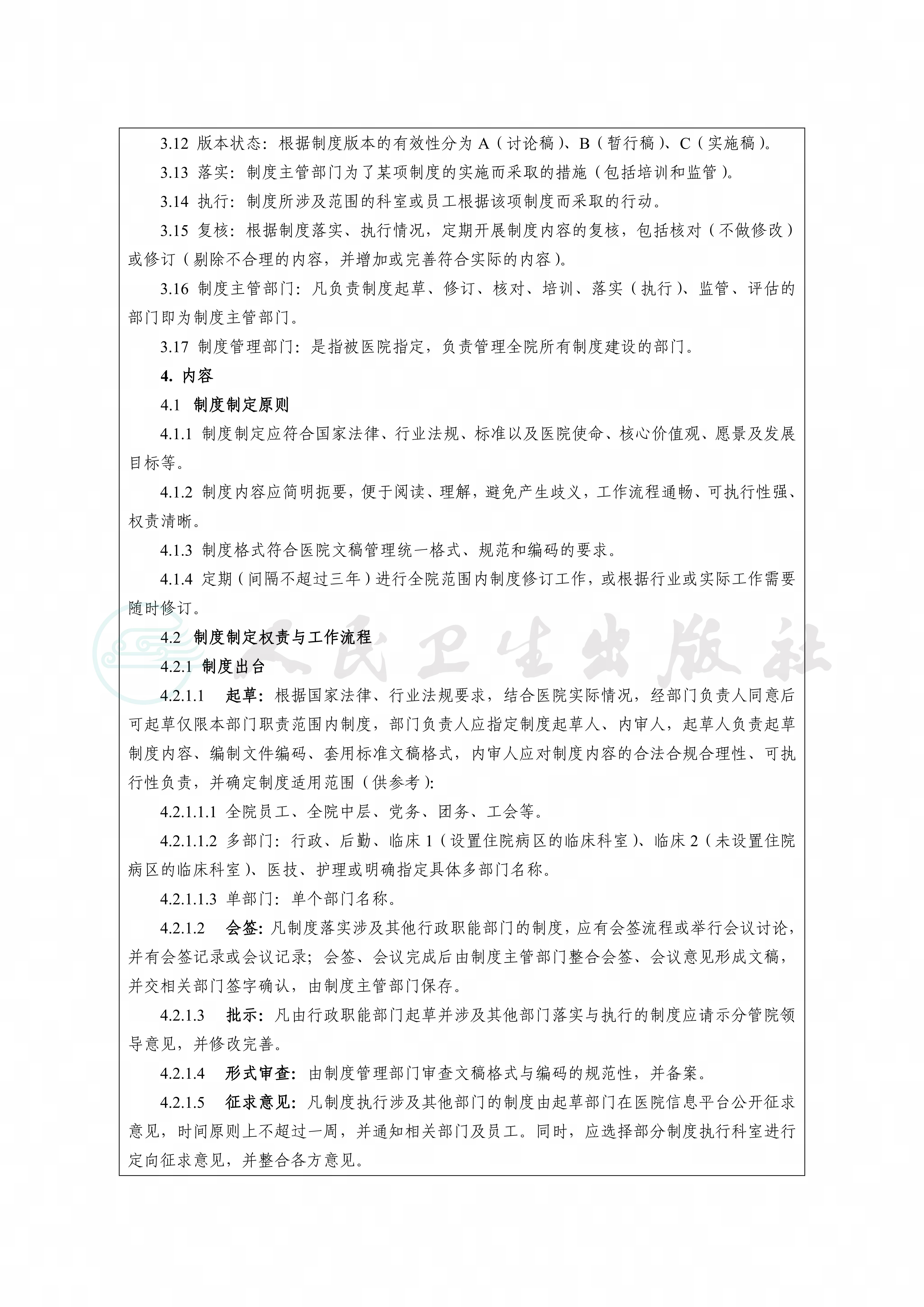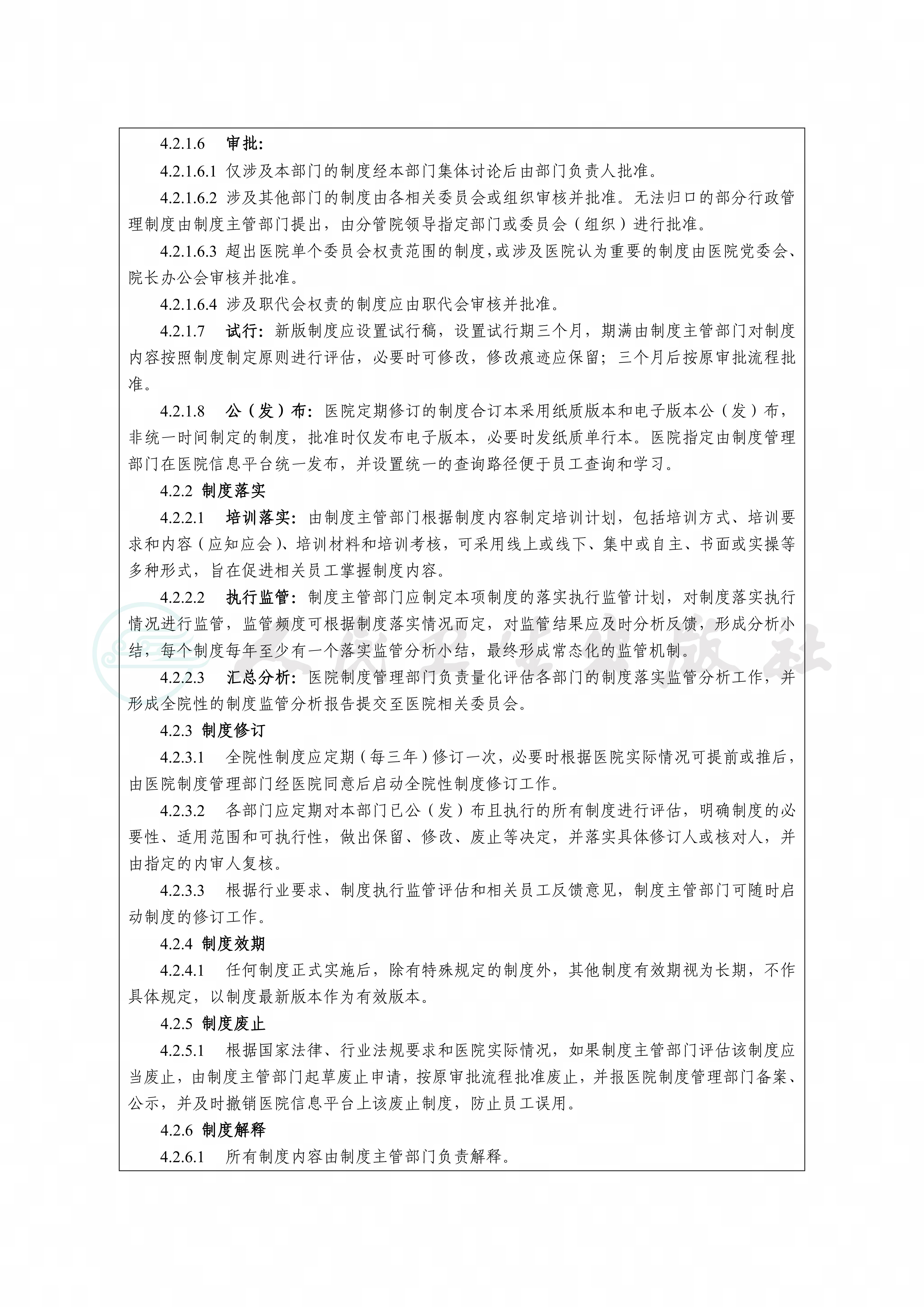 制度是规范医院员工和医务人员的行为的重要手段和评价依据,全院统一的制度管理流程有助于完善医院及各部门、科室制度建设,提升制度有效性,形成医院特有的制度文化。通过医院制度管理制度的制定,有助于帮助员工理解制度的产生过程、制度的共性特征,促进制度的规范应用。