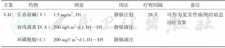 | VAC 长春新碱(V) 1.5 mg/m2,D1 静脉注射 28天 可作为复发性病例的姑息 治疗方案 放线菌素D(A)200 ug/(m2·d),D1~D5静脉滴注 环磷酰胺(C)200 mg/(m2·d),D1~D5静脉滴注 |