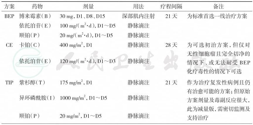 | BEP 博来霉素(B) 30 mg,D1、D8、D15 深部肌内注射 21天 为标准首选一线治疗方案 依托泊苷(E)100 mg/(m2·d),D1~D5静脉滴注 顺铂(P)20 mg/(m2·d),D1~D5静脉滴注 CE 卡铂(C) 400 mg/m2,D1 静脉滴注 28天 为可选初治方案,但仅对 无性细胞瘤且完全切净的 情况下、或无法耐受BEP 化疗毒性的情况下可选 依托泊苷(E)120 mg/(m2·d),D1~D3静脉滴注 TIP 紫杉醇(T) 175 mg/m2,D1 静脉滴注 21天 作为治疗复发性病例且仍 有治愈可能的方案;但原始 方案剂量及毒副反应很大, 此为减量版,需密切监测及 支持治疗 异环磷酰胺(I) 1000 mg/m2,D1~D5 静脉滴注 顺铂(P) 20 mg/m2,D1~D5 静脉滴注 |