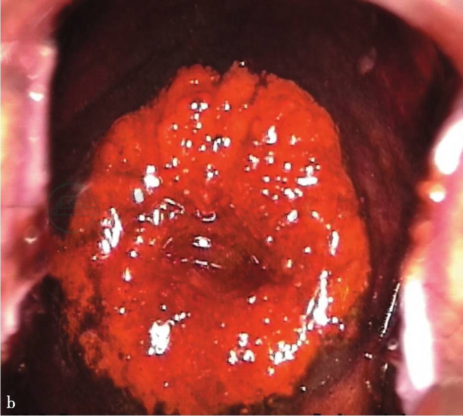 大部分宫颈炎性病变(如宫颈糜烂样改变)和宫颈的未成熟鳞状化生上皮常常不吸碘,而导致VILI的结果呈假阳性,因此,我们应认真识别相关的染色图像,提高诊断宫颈病变的准确性。宫颈未成熟鳞状化生上皮以宫颈转化区内的补丁样、模糊的不吸碘或部分吸碘区域为特征,而炎性病变的图像以整个宫颈(不限于转化区)呈弥散、不规则的、补丁样、边界模糊不清,延及或不延及阴道壁的不吸碘或部分吸碘区为特征。