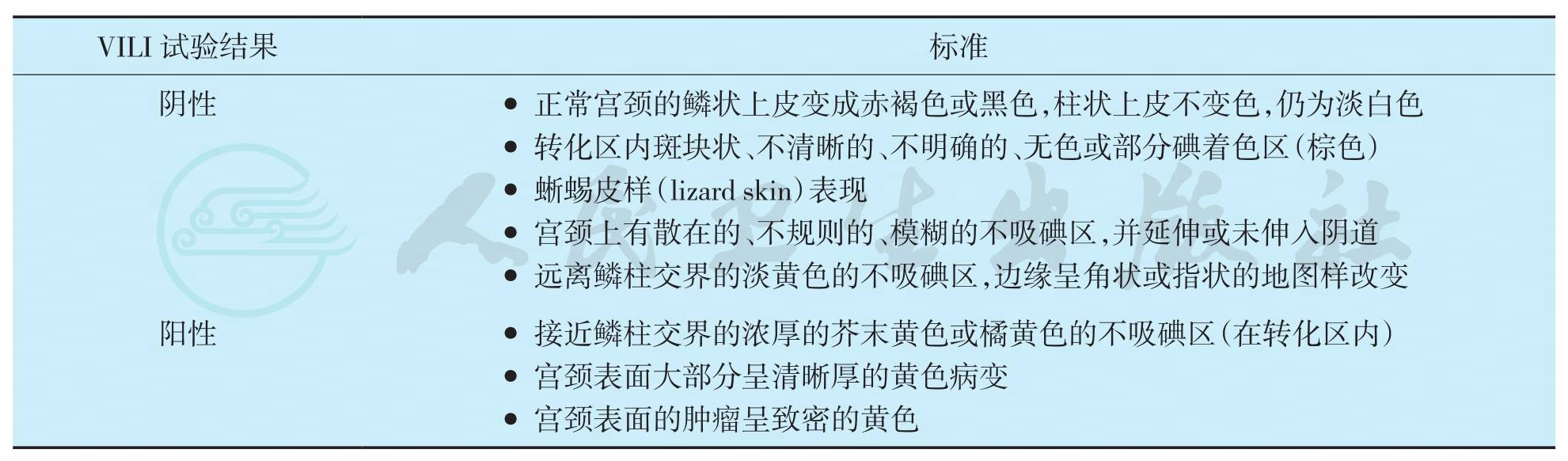 碘试验近年又称为 VILI,Sankaranarayanan R等(2003)首先提出并描述了VILI诊断宫颈病变的标准及参考图谱模式,其判断VILI试验结果的标准见表1。