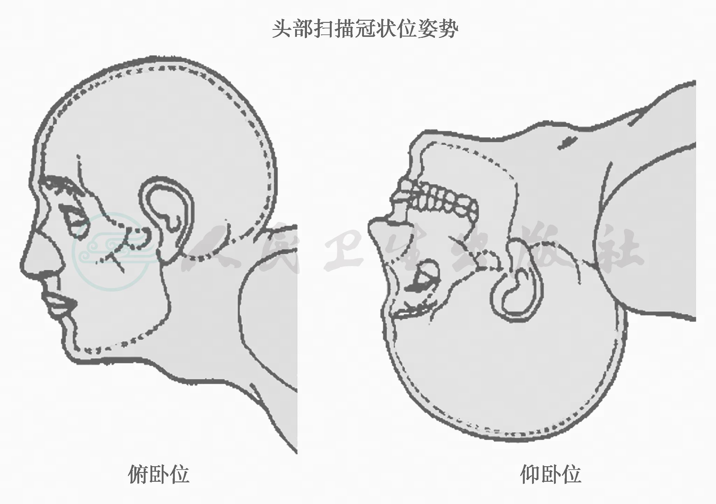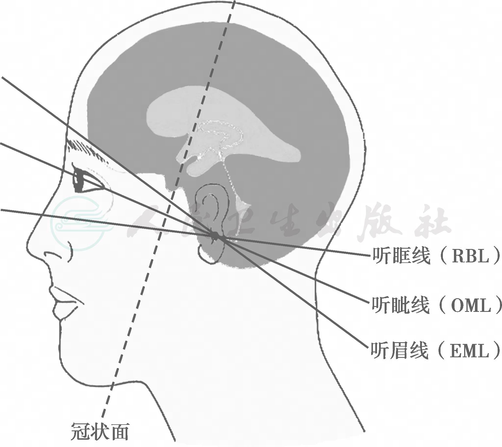 颅脑、五官和颈部常用的扫描方法为平扫和增强扫描。检查体位通常为仰卧位,但颅脑的某些部位检查也采用俯卧位,如脑垂体检查(图1)。颅脑CT检查须注意扫描基线,有听眶线(RBL)、听眦线(OML)和听眉线(EML)(图2)。由于不同扫描基线的断面解剖显示结构有所不同,在扫描时需加以注意。