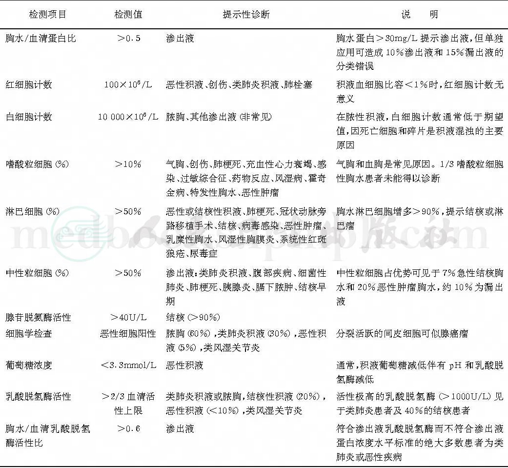 (1)符合以下3个标准之一为渗出液:胸水/血清蛋白>0.5,胸水/血清LDH>0.6,胸水LDH>2/3正常血清LDH上限。