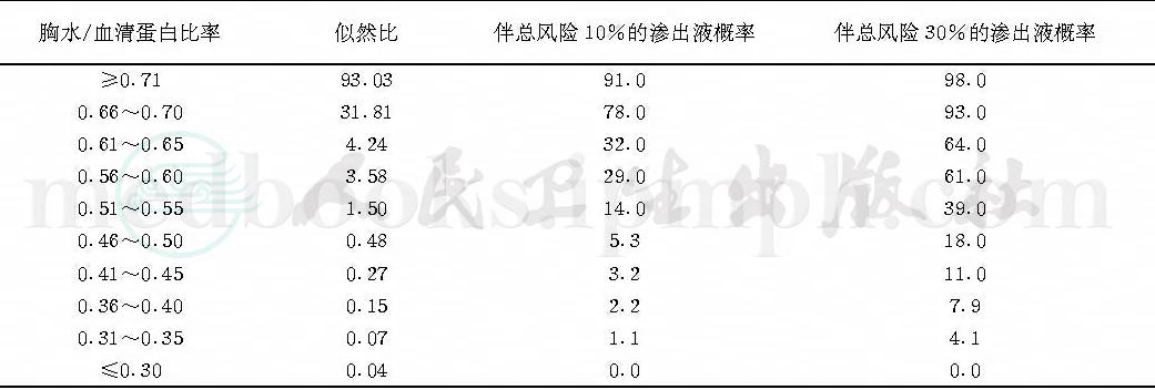 表2 胸水/血清蛋白比率的似然比与渗出液概率