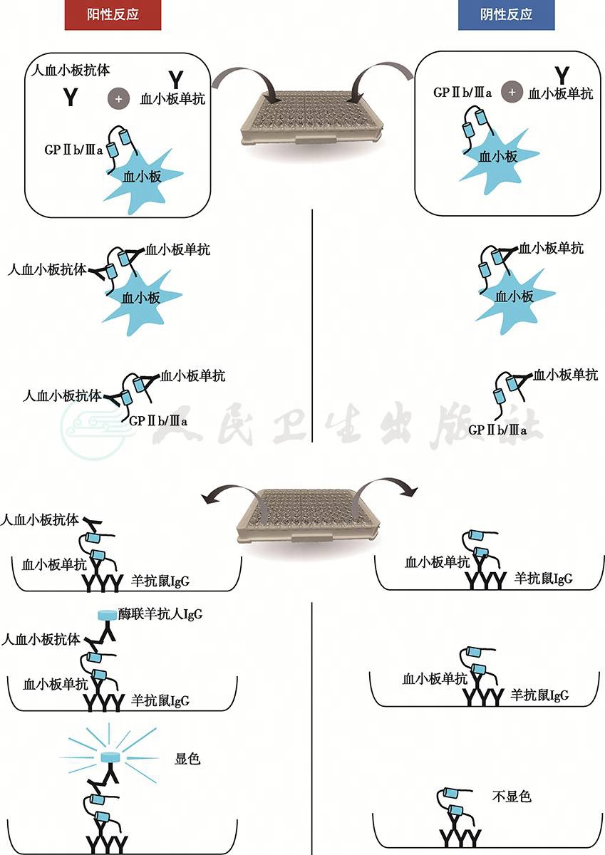单克隆抗体特异的血小板抗原固定试验(monoclonal antibody-specific immobilization of platelet antigens assay,MAIPA)是1987年Kiefel等报道的一项应用较为广泛的免疫学技术。血小板先结合人的同种抗体,然后与不同的抗血小板膜糖蛋白的(抗GPⅠb、GPⅡb、GPⅢa、GPⅨ、HLA等)鼠抗人血小板单克隆抗体孵育。经洗涤后裂解血小板,将产物移至包被的羊抗鼠IgG微孔板内,通过加入辣根过氧化物酶标记羊抗人IgG,经酶底物显色可以检测血小板膜糖蛋白特异的同种抗体(图1)。