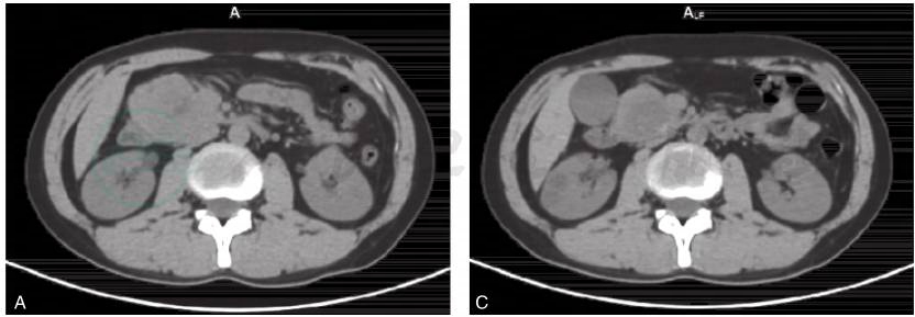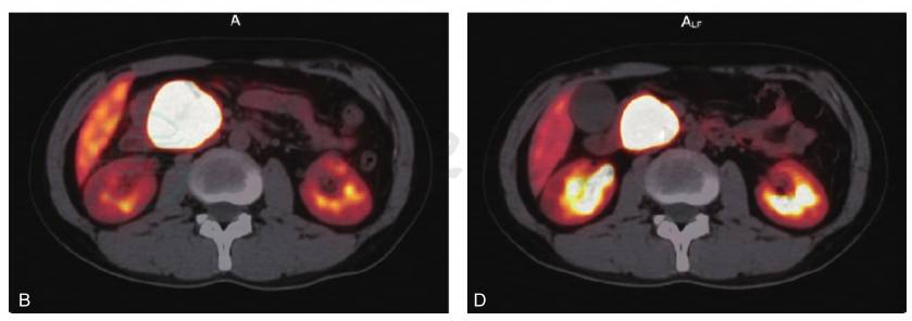 患者,男,25岁。胰腺神经内分泌肿瘤。经过4次PRRT后,肿瘤原发病灶缩小50%,症状基本消失,肿块中央有部分坏死。分别为治疗前CT图(A)、治疗前PET/CT融合图(B)、4次PRRT治疗后CT图(C)和4次PRRT治疗后PET/CT融合图(D)。
