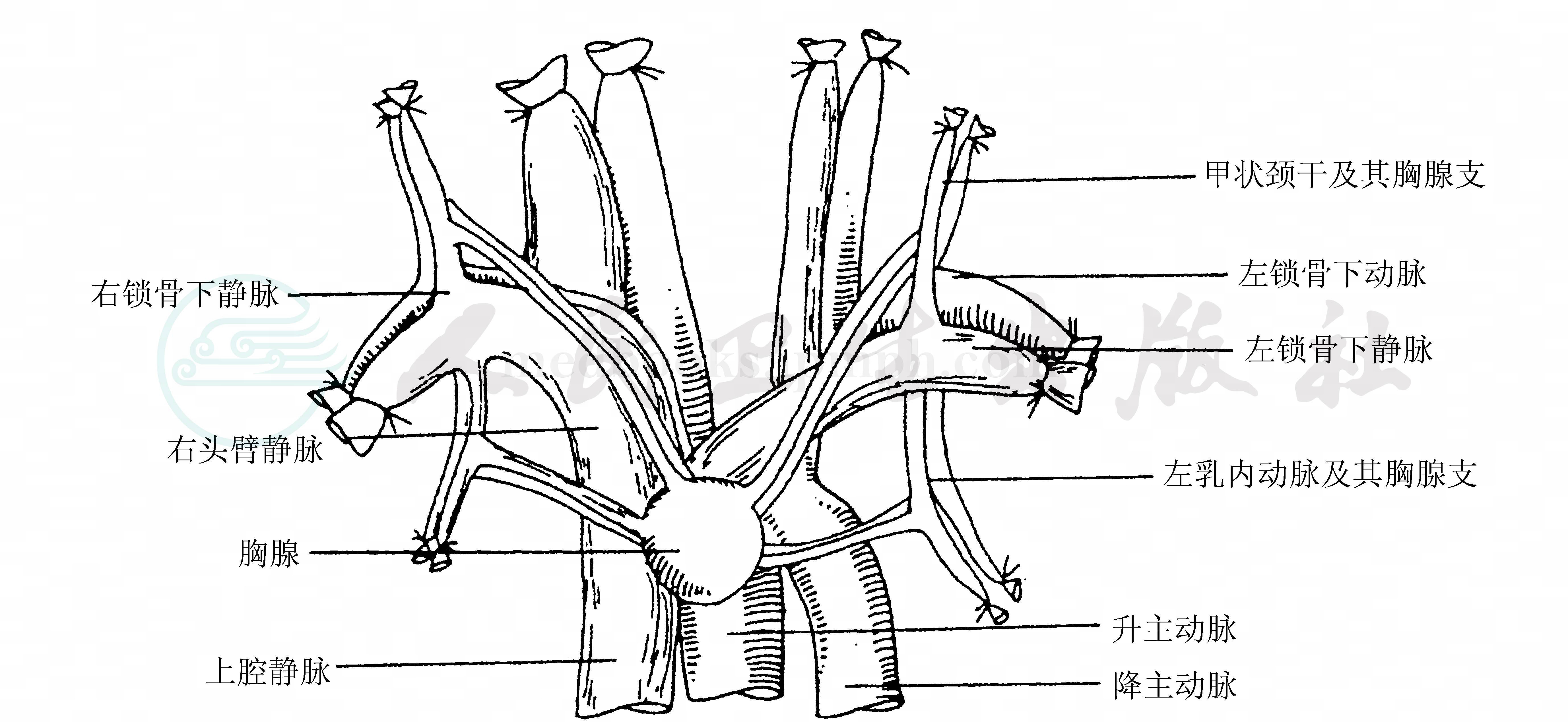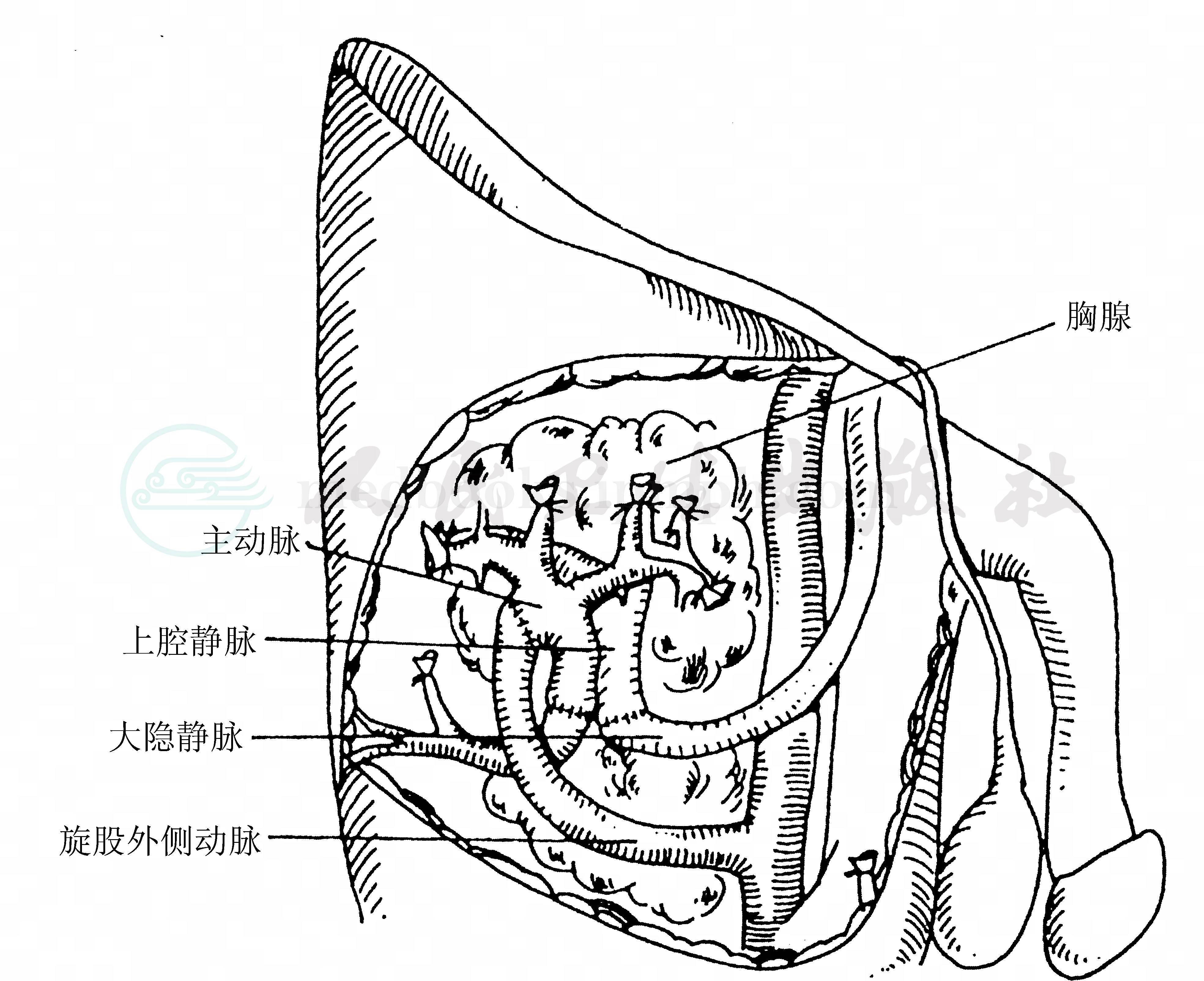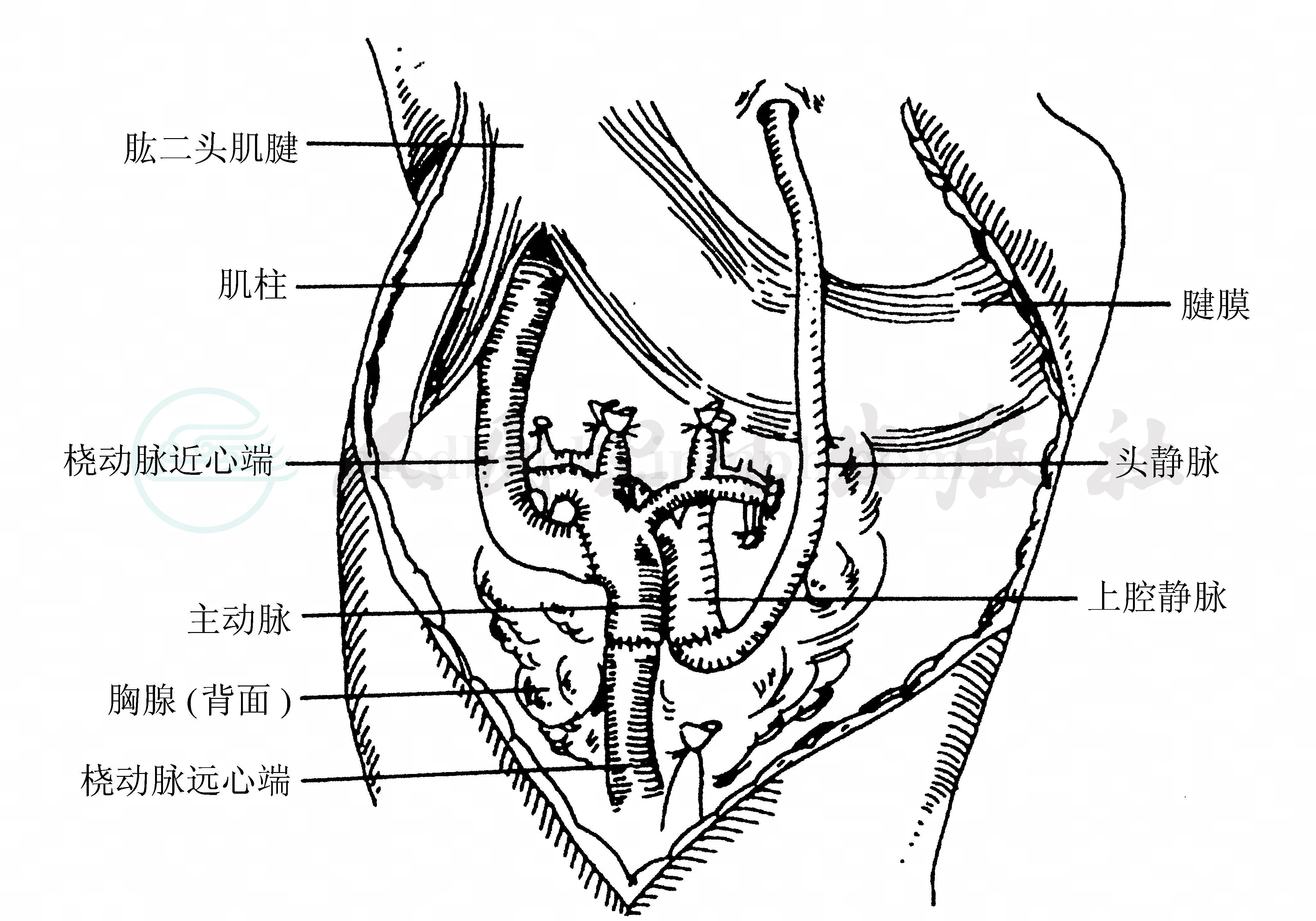 (3)带血管胸腺的切取:死胎仰卧于平底器械盘上,周围放冰块,以减少热血时间。消毒铺巾,正中切开胸部皮肤,劈开胸骨,剪去两侧锁骨下动脉及其分支胸腺动脉,游离、切断、结扎其肋间分支。继而游离、切断、结扎两侧的锁骨下动脉及静脉、椎动脉及静脉和颈总动脉及静脉。然后切开心包,寻找主动脉的起始部。又于主动脉右侧小心分离出上腔静脉,夹钳后在两把钳之间切断,近心端缝扎,离心端暂时结扎,结扎线不剪断,