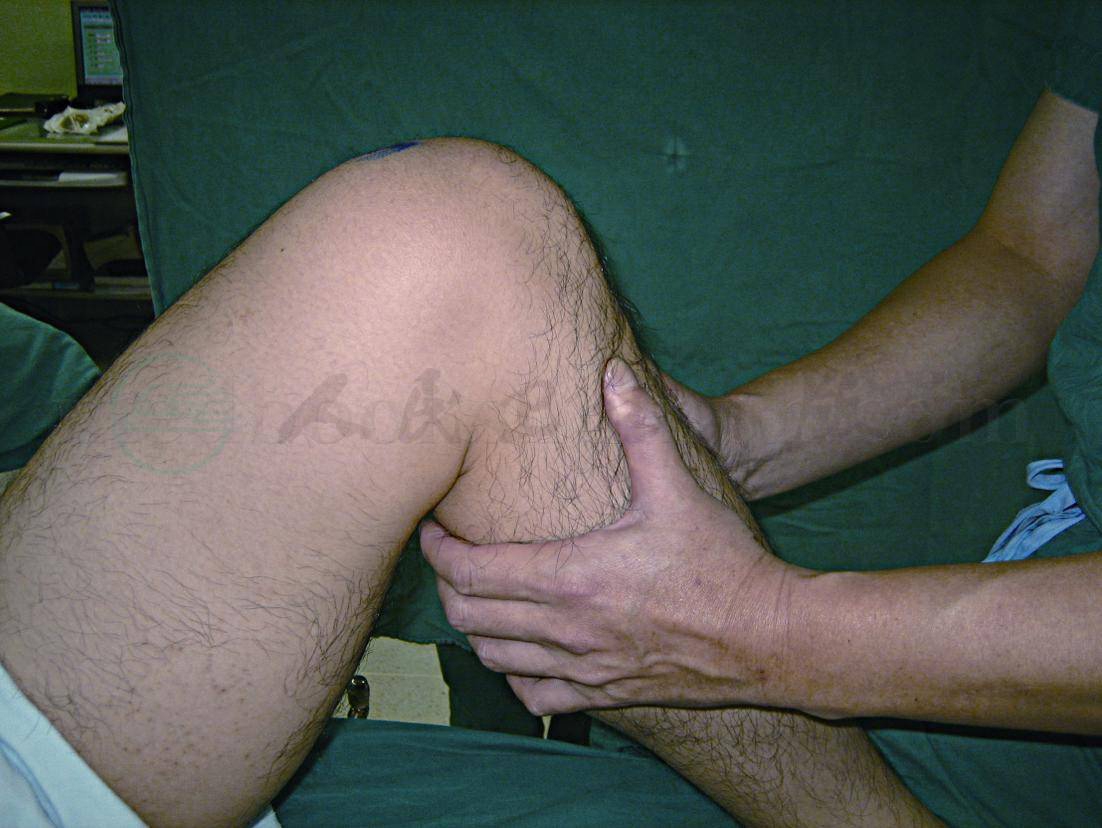 隧道钻取:在放置于50°位的胫骨导向器的引导下,使用一个带10mm套筒的开髓钻钻孔。在股骨内侧髁中部作3cm长纵行切口,关节镜放置于前外侧入口,使用股骨钻从前内侧入口放入关节,导向器的尖放在后十字韧带股骨侧的前脚上,打入导向针,使用6mm开髓器钻通为前外侧束准备的股骨隧道,然后用同样方法钻通为后内侧束准备股骨隧道。两个隧道开口的距离应该在10mm,以避免隧道的塌陷。