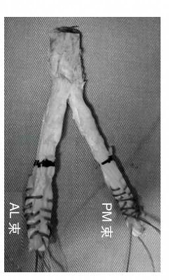 腘腱的切取:切取20cm长的半腱肌腱和股薄肌肌腱。使用2号爱惜康缝线编织缝合法缝合肌腱,移植物包括半腱肌腱和股薄肌肌腱各两股。使用5毫米宽Mersile带穿在移植物的环状部分,然后用3-0的可吸收Vicryl线将四股肌腱缝到一起。