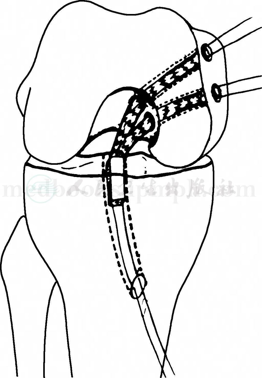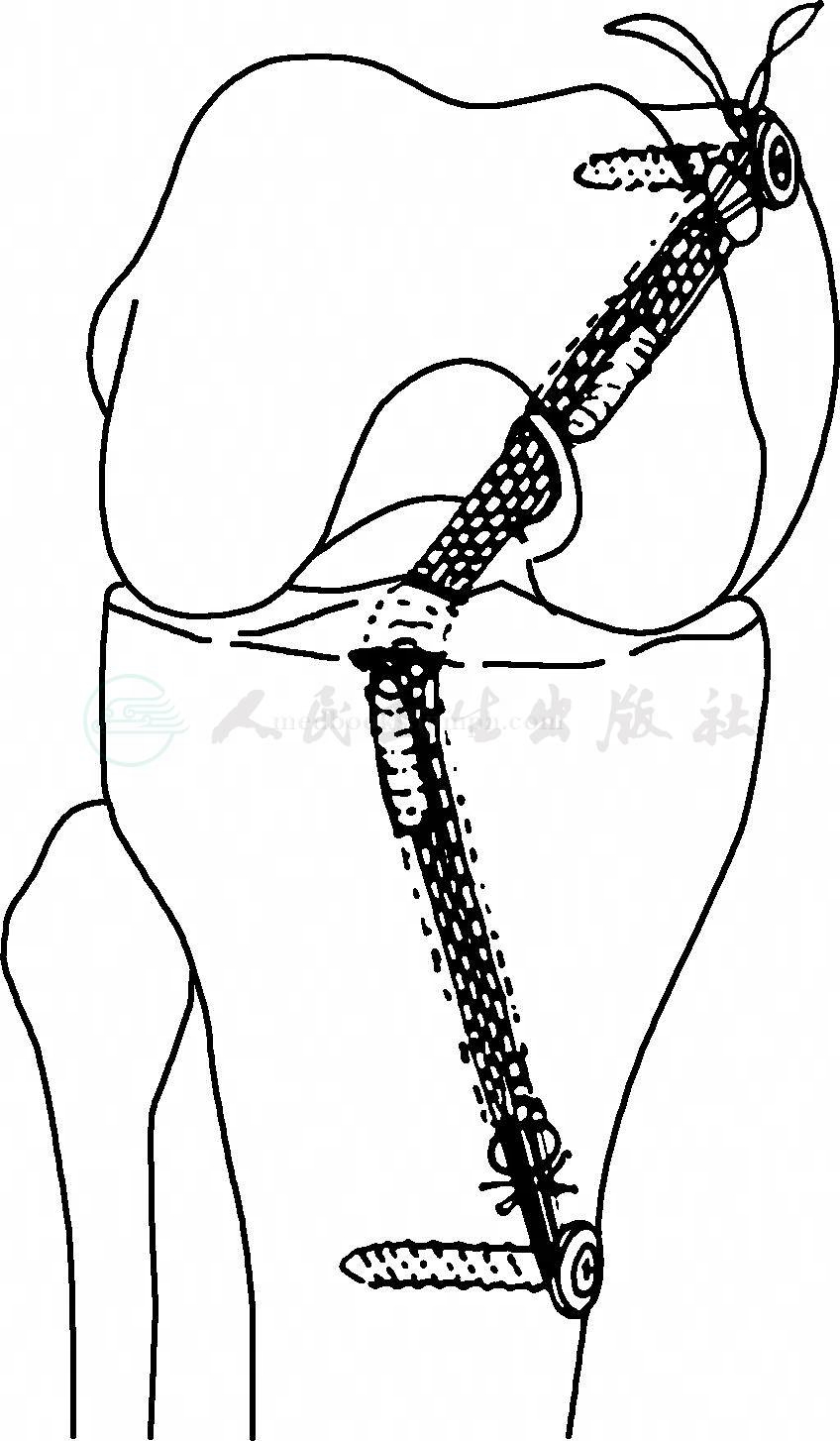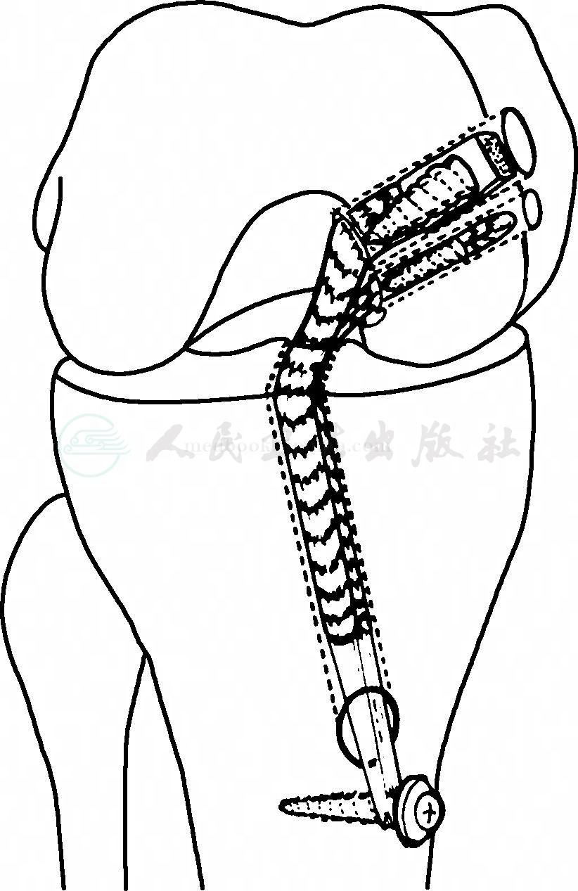 固定股四头肌腱移植复合物,重建后十字韧带前外侧束。在保持移植物张力的同时被动活动膝关节进行观察,然后屈曲膝关节到70°位,在胫骨近端施加一个前抽屉应力,使得胫骨平台内侧保持在略高于股骨内侧髁的正常高度。牵引移植物的缝线牢牢地系在螺钉和垫片上。在固定半腱肌腱复合物的时候,则应将膝关节放于伸直位,将双束的牵引线打结固定在同一个螺钉和垫片上(图7)。