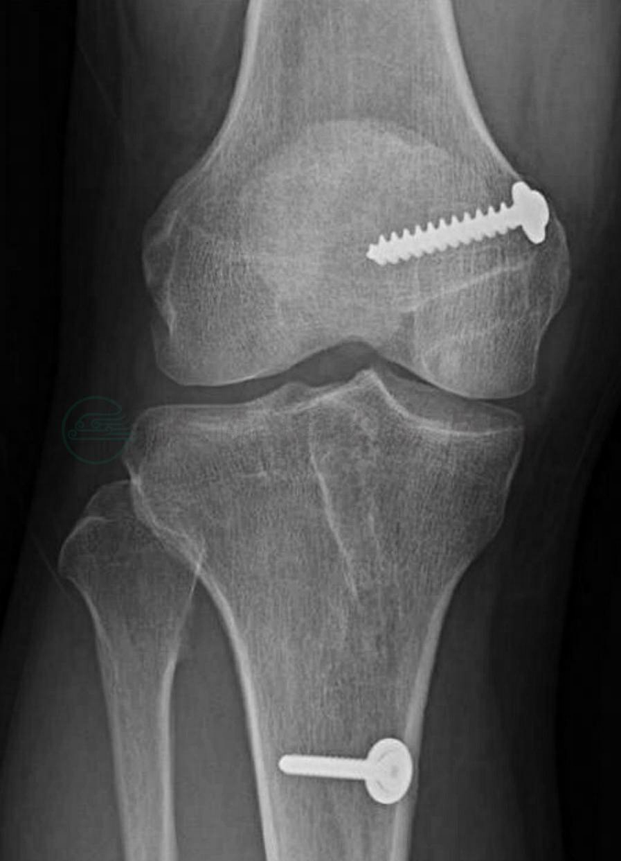 移植物的固定:从胫骨隧道将肌腱复合物引入关节,并将肌腱则穿入股骨上的两个隧道中。骨栓留在胫骨隧道的近端,并用9mm×20mm的钛螺钉固定。在保持移植物张力的同时被动活动膝关节进行观察,然后屈曲膝关节到70°位,在胫骨近端施加一个前抽屉应力,使得胫骨平台内侧保持在略高于股骨内侧髁的正常高度。移植物的前束用生物螺钉固定在前侧的股骨隧道上。而后将膝关节放于伸直位,前抽屉试验应力下将后侧束用生物螺钉固定在后侧的股骨隧道上。将双束的牵引线打结固定在股骨内侧髁上。然后测试膝关节的活动度和稳定性(图6)。