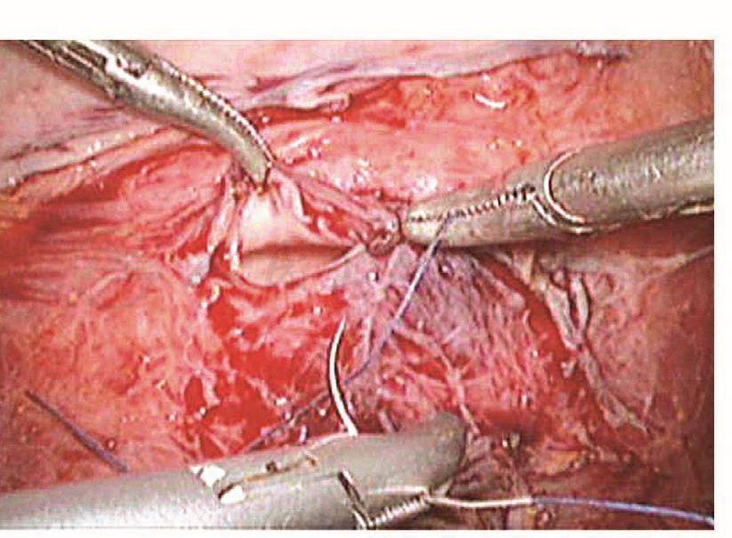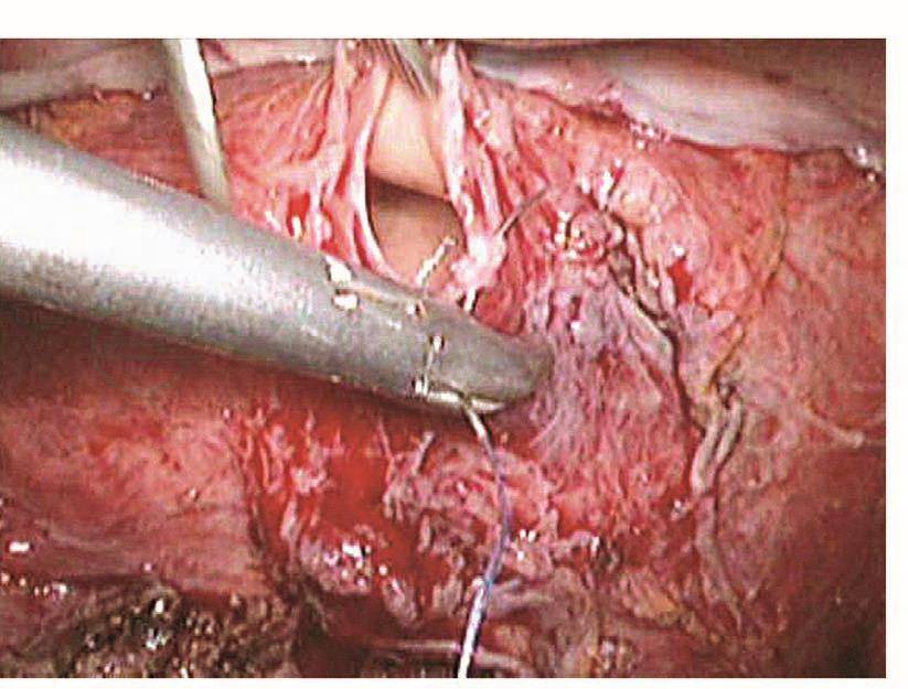缝合操作不规范,也会引起输尿管的损伤。笔者曾经遇一例LTH手术,术后第4天发现阴道水样分泌物,膀胱镜检查证实膀胱阴道瘘,寻找原因,主要是缝合阴道残端时过多过深。笔者会诊外院一例LTH手术后2个月腰部疼痛的患者,经过IVP检查,发现是输尿管梗阻导致肾积水,逆行插管顺利,没有停留双J管,一个月后又出现腰部疼痛,最后留置双J管3个月后痊愈。估计该例患者输尿管梗阻的原因是由于在缝合盆底腹膜时过度牵拉腹膜,使输尿管形成直角导致梗阻。
