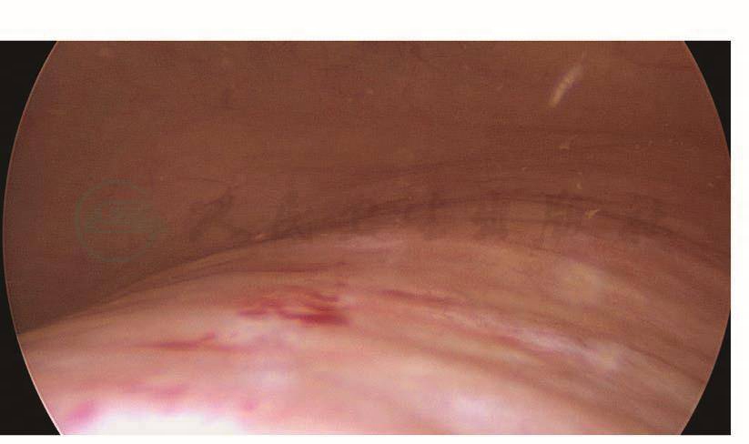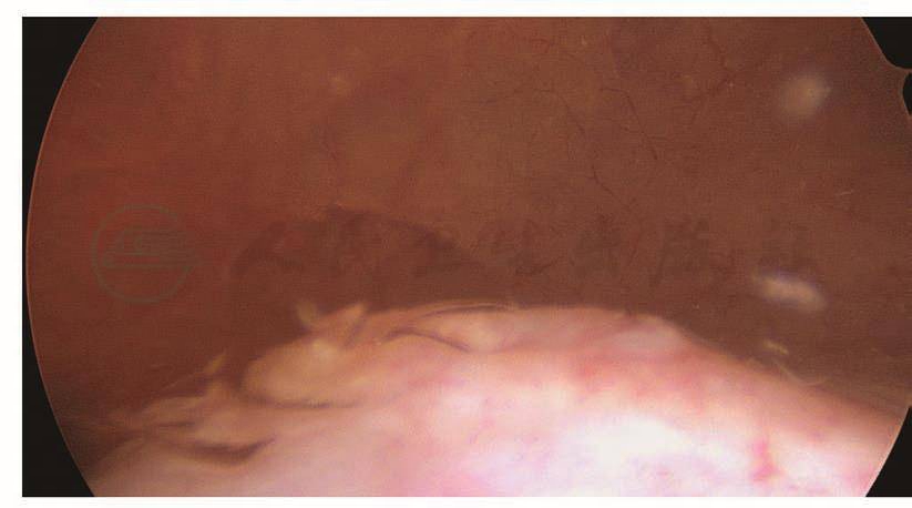 如果术中无法确认输尿管是否损伤,可以考虑在结束手术前进行膀胱镜检查,观察输尿管出口的喷尿情况。膀胱镜下先找到膀胱黏膜,在膀胱底部找到突出的部位,此处即为膀胱三角区,输尿管出口位于其两侧。有时候输尿管蠕动的间隔比较长,必要时可以静脉注射呋塞米20mg,促进输尿管蠕动、喷尿。如果观察到两侧输尿管出口正常蠕动并有喷尿,说明输尿管没有断裂性损伤,但不能排除热损伤(图117~图120)。