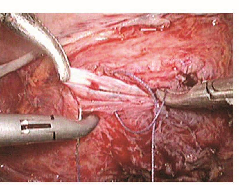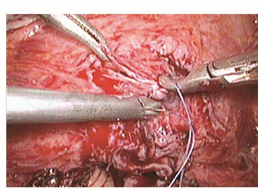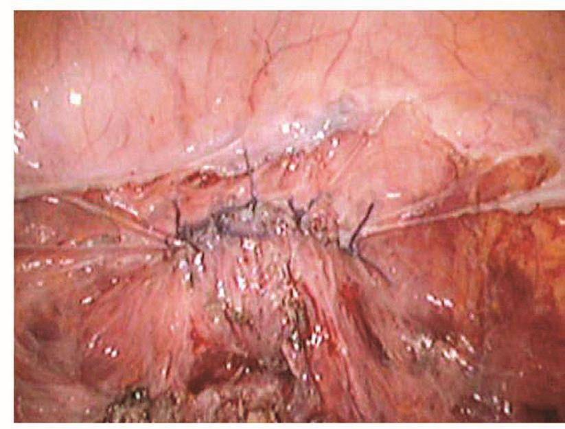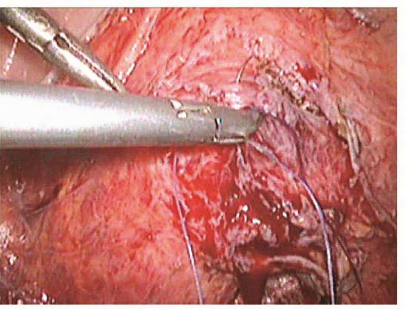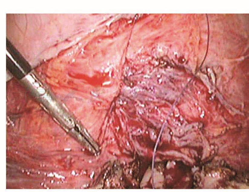 如果损伤长度>5mm,则需要手术处理。以往是先行暂时性肾盂造瘘下修补:根据笔者经验,如果术后15天内发现损伤,则可以直接采用腹腔镜下修补,可以减轻患者痛苦,缩短住院时间。该方法最关键的步骤是游离粘连的输尿管,因为,术后15天内组织开始出现明显的组织粘连。术前必须与患者及家属沟通并征得泌尿外科大夫同意后才进行手术。操作时,腹腔镜下探查盆腔,明确粘连程度及输尿管走向,分离粘连组织,暴露损伤的输尿管创面,从膀胱镜下插入导管,对合损伤面,用4-0的可吸收线在输尿管前、左、右三个方位各穿合一针。缝合时缝针从损伤口远端输尿管浆肌层进针,穿过黏膜层,再从近端黏膜层进针,穿出浆肌层,拉紧穿线,镜下打结。修补损伤面后,在膀胱镜下取出导管,再插入输尿管镜,明确输尿管通畅。然后,通过输尿管镜放进双J型支架,床边X线机明确双J管的位置,盆腔放置引流管,如果引流不多,48小时后取出。术后3个月在膀胱镜下取出双J管(图111~图116)。