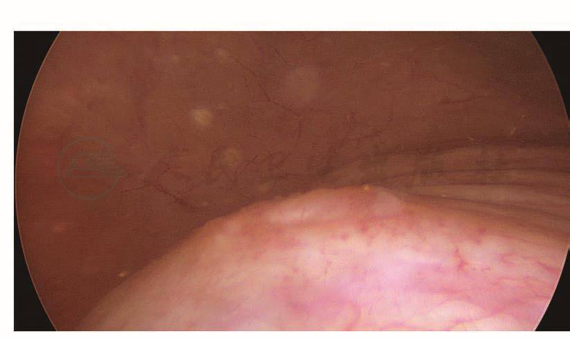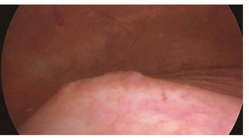 膀胱宫颈间隙比较疏松,剪开腹膜反折很容易将膀胱推离到宫颈外口,一般不会损伤膀胱。但在膀胱壁电凝止血,如果操作不当,就会造成膀胱壁热损伤。或由于宫颈下段手术史导致膀胱粘连,分离时就有可能损伤膀胱。因此,在膀胱壁电凝止血时,必须看清出血点,用双极钳快速电凝出血点,“点到即止”,切不可对组织长时间、大范围电凝。在分离粘连的膀胱时,如果怀疑膀胱损伤,可以通过尿管灌注加入亚甲蓝的生理盐水300~500ml,使膀胱充盈,镜下观察是否有蓝色液体流出,判断膀胱是否损伤。