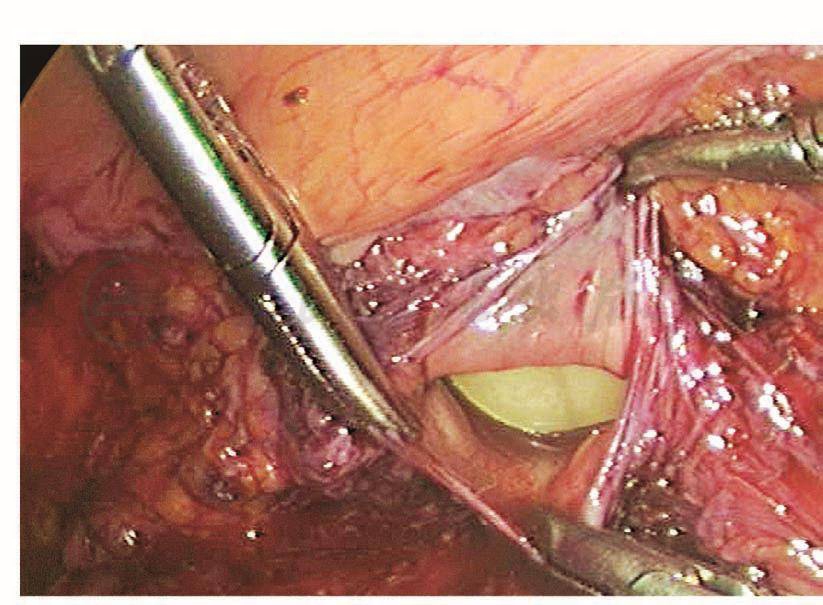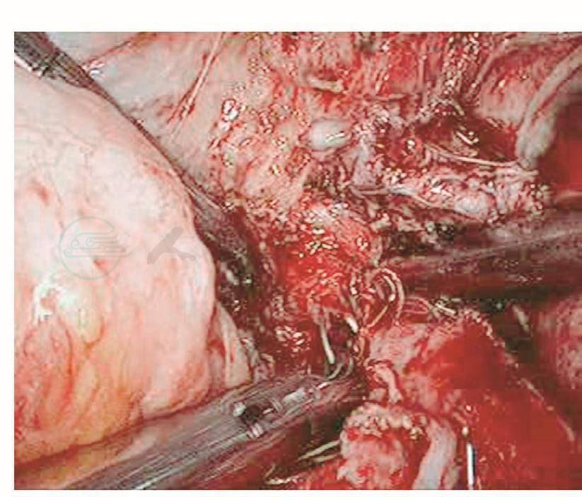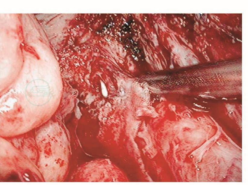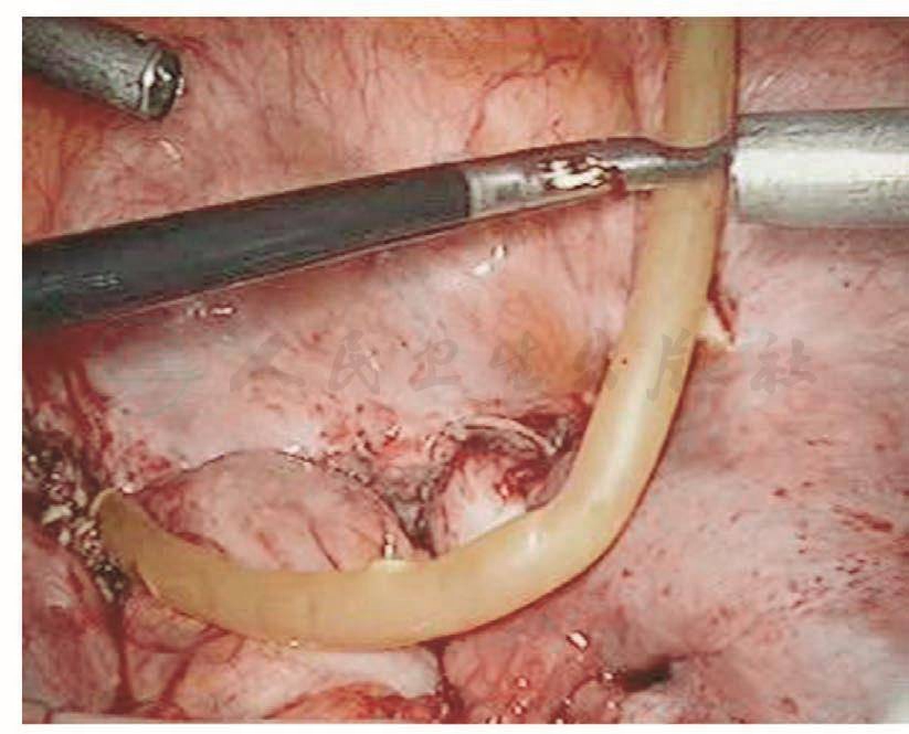 在有盆腔粘连的子宫切除手术中,最容易损伤输尿管。笔者早期在进行一例LTH时,由于盆腔粘连,右侧输尿管穿行于粘连带紧贴右侧子宫骶骨韧带,并附于子宫下段,在用超声刀锐性分离粘连组织过程中,发现一条索状组织有液体流出,仔细观察,始知损伤输尿管。另一例是子宫肌腺病行LTH术,由于粘连严重,手术极为困难,手术结束前详细检查各创面,没有发现输尿管损伤的任何迹象,术后3天,病人出现发热、尿少、并有腹膜炎症状,经IVP证实输尿管损伤,留置双J管3个月后痊愈。