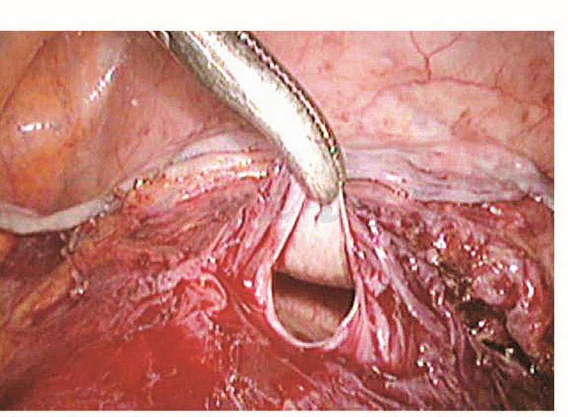 对于严重的盆腔粘连,特别是子宫内膜异位症需要行LTH时,看清输尿管的解剖位置尤其重要,如果镜下无法确认输尿管的位置,必须打开阔韧带后叶,解剖出输尿管。有时候在输尿管正常行径的部位寻找,即使暴露了髂内外血管,消耗1~2小时,也无法看到输尿管的踪影,却原来发现输尿管与漏斗韧带黏在一起,或躲在子宫骶骨韧带的深处。所以,打开阔韧带后叶,在漏斗韧带的下方、骶骨韧带的外侧找不到输尿管时,就应该在上述的两个部位寻找,先游离输尿管,再进行手术。
