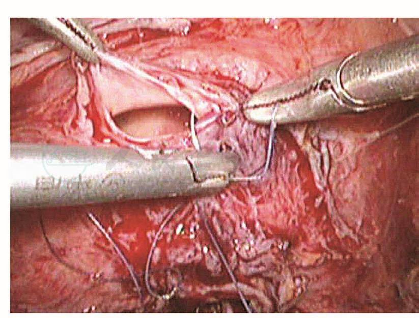 膀胱破裂后,术中能及时发现并修补,预后比较理想。以往凡是膀胱破裂基本都是中转开腹并由泌尿大夫修补,现在妇科大夫基本已掌握了膀胱破裂修补的技巧,而且腹腔镜下的操作技巧也比较娴熟,所以膀胱破裂后的修补基本都是由妇科内镜医生进行。膀胱裂口的位置决定修补的难度,膀胱前壁及侧壁相对容易,而后壁相对难度较大。膀胱裂口缝合后的愈合与缝合的方法密切相关。以前修补膀胱裂伤是采用不吸收的缝线,所以最主要的问题是怕缝线穿透了膀胱黏膜,引起术后膀胱结石,现在采用的是可吸收缝线,术后引起膀胱结石的问题已得到了解决,只要组织层正确对合,裂伤可以愈合。缝合前先将裂口两侧的膀胱黏膜边缘适当修剪齐,缝合时用5-0可吸收线从距离膀胱裂口边缘约5mm进针,穿过黏膜层,镜下打结后连续缝合黏膜层,再用3-0可吸收线8字形缝合膀胱肌层(图103~图110)。修补膀胱破裂口时必须要注意: