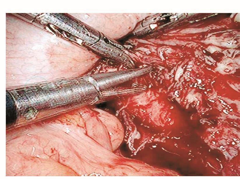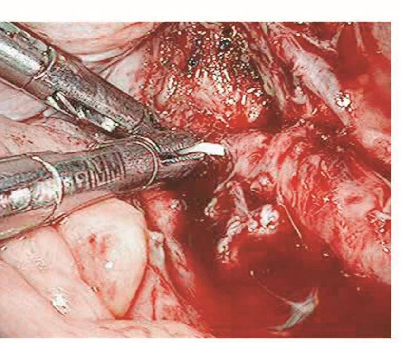 离断子宫血管前,提起离断的附件,拨开肠管,镜下寻找到盆壁腹膜后的条索状物,轻敲促其蠕动,根据蠕动方向判断其进入子宫颈管与子宫血管的距离,在输尿管上方至少20mm、或相当于子宫颈峡部用弯分离钳钳夹子宫血管,然后在分离钳的上方用双极钳电凝血管,再用剪刀、超声刀等将其离断。