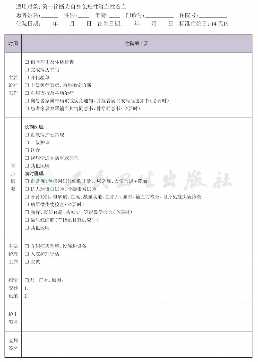 二、 自身免疫性溶血性贫血临床路径表单(温抗体型、免疫性)