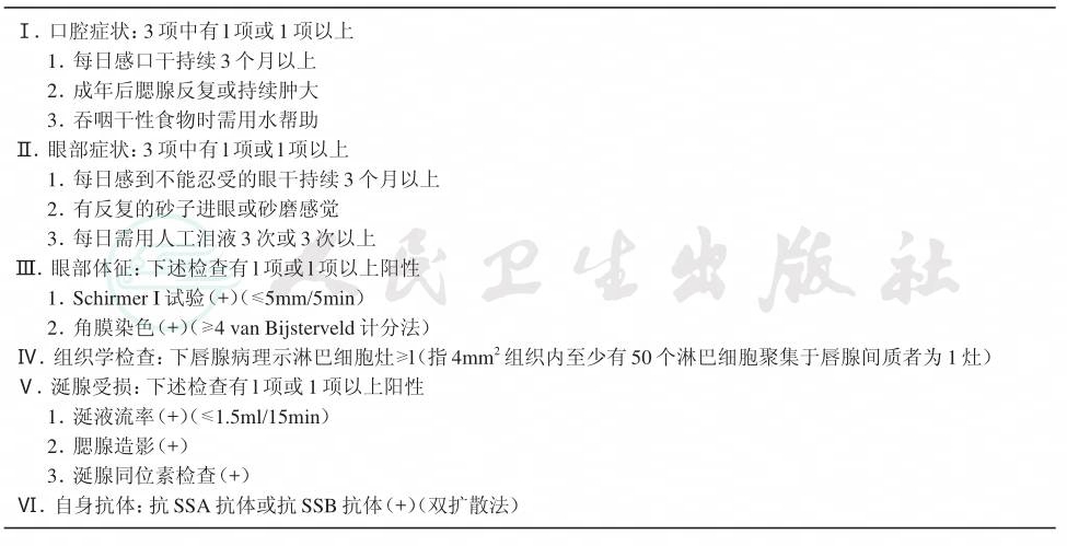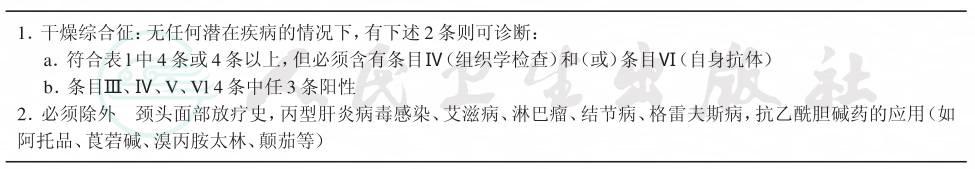 根据2002干燥综合征国际分类标准(表1、2),《临床诊疗指南 风湿病学分册》(中华医学会编著,人民卫生出版社),《干燥综合征诊断及治疗指南》(中华医学会风湿病学分会,2010年)。