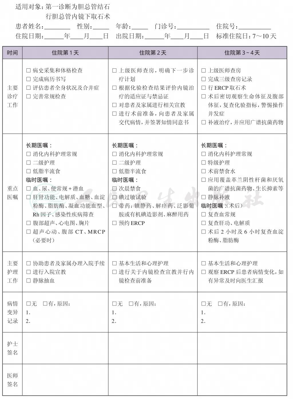 1.出现并发症(ERCP相关性胰腺炎、胆道感染、出血、穿孔及麻醉意外者)等转入相应临床路径。