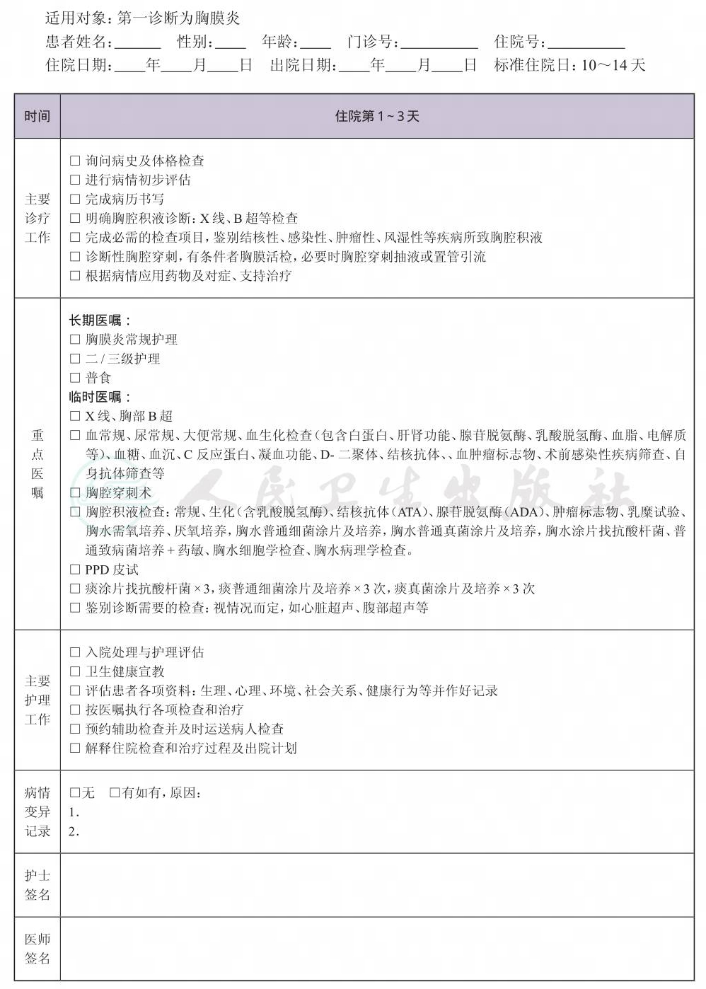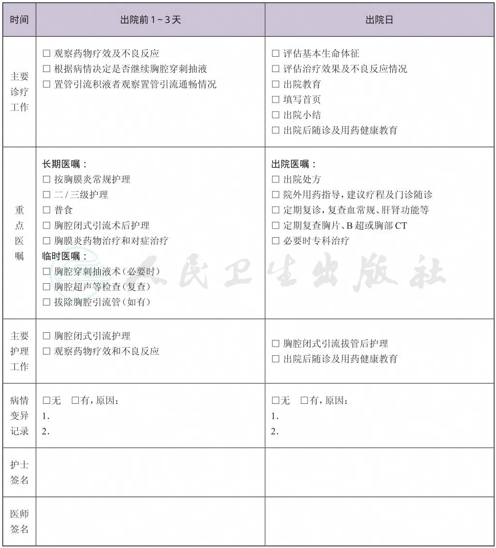 二、 胸膜炎临床路径表单