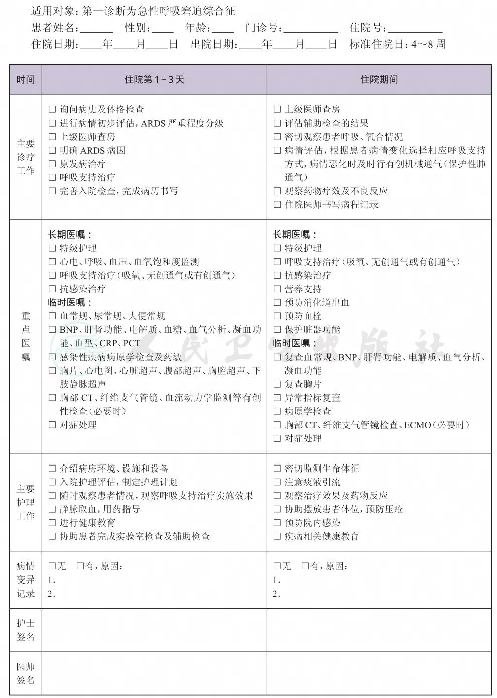 二、 急性呼吸窘迫综合征临床路径表单