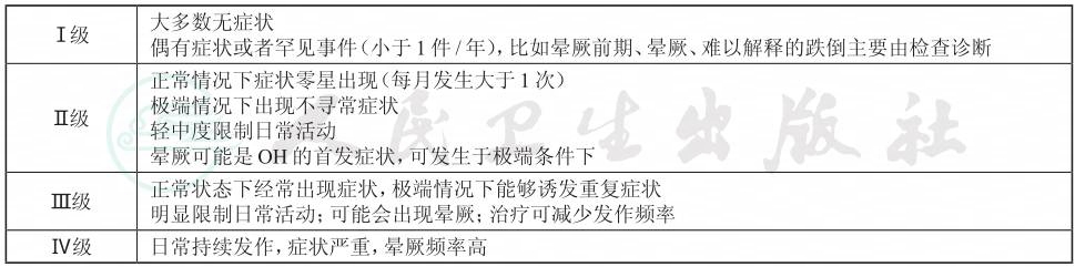 3.分级 对于有症状的患者,应该在心血管自主神经方面的专家指导下至少行人体直立实验和动态血压监测。OH患者的治疗应该根据患者症状严重程度和发作频率来管理。我么可以利用一些工具来帮助我们对症状进行分级,具体见下表。