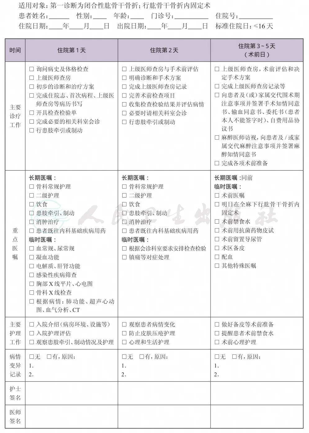 二、 肱骨干骨折临床路径表单