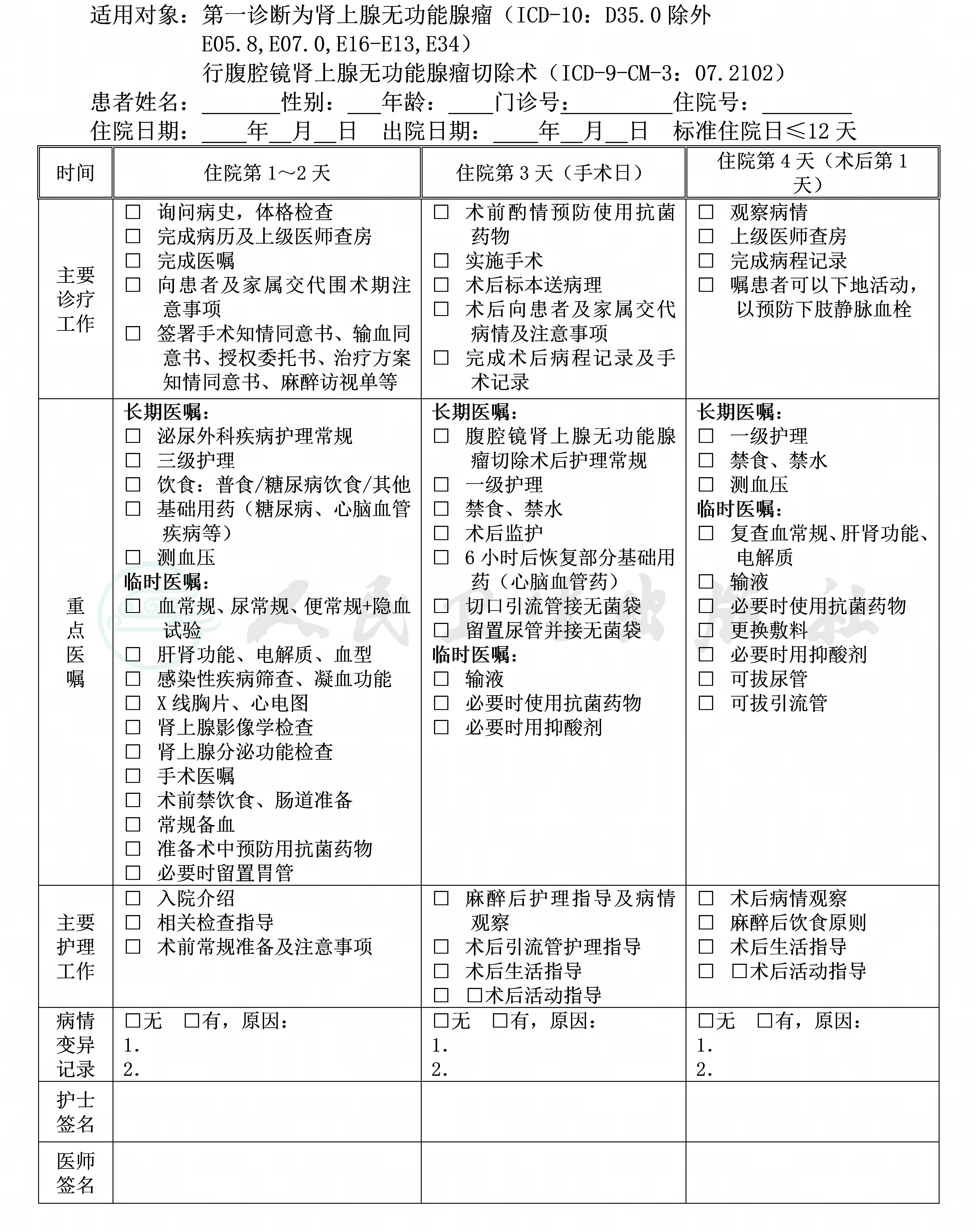 二、肾上腺无功能腺瘤临床路径表单