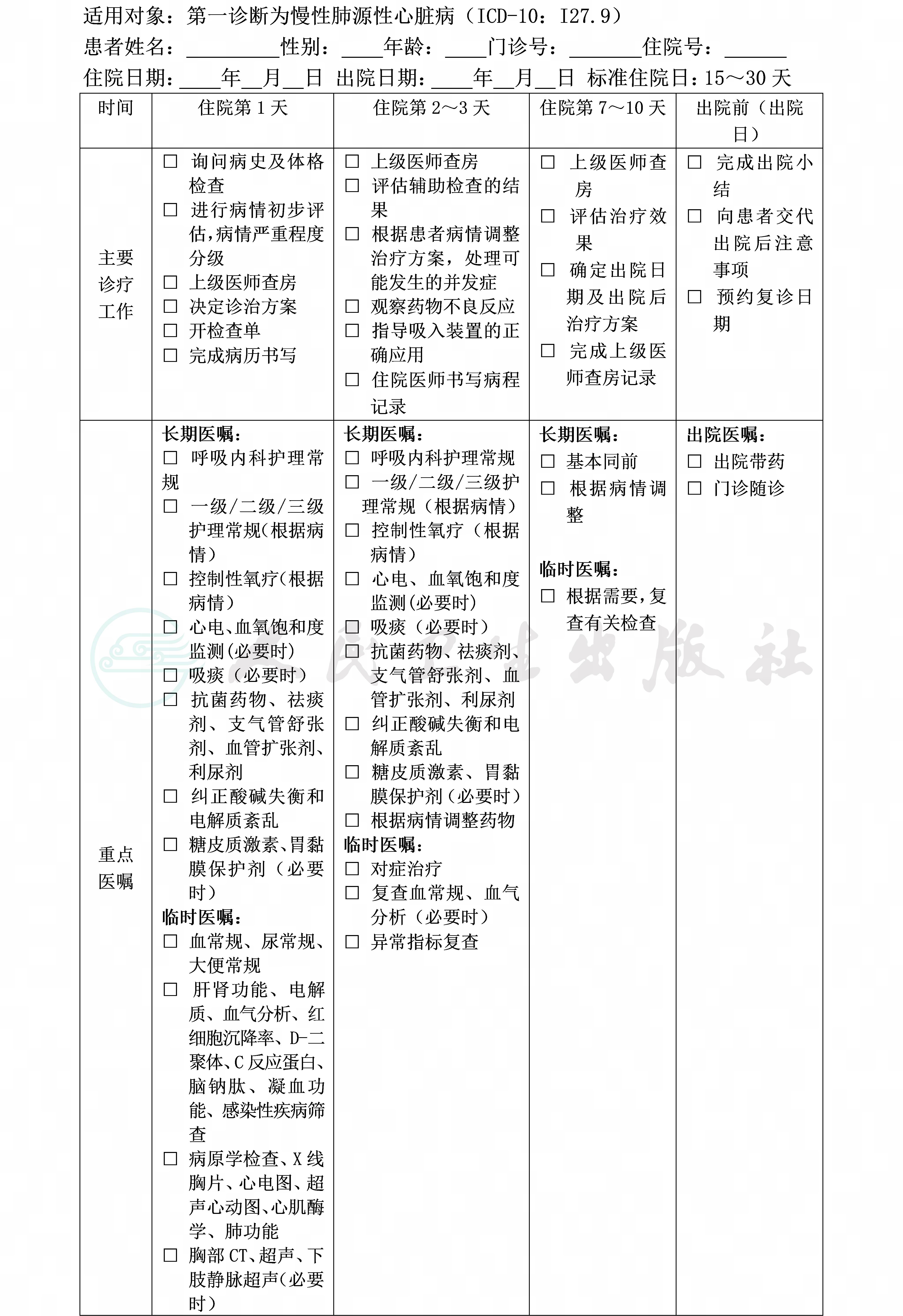 1.第一诊断必须符合ICD–10:I27.9慢性肺源性心脏病疾病编码。