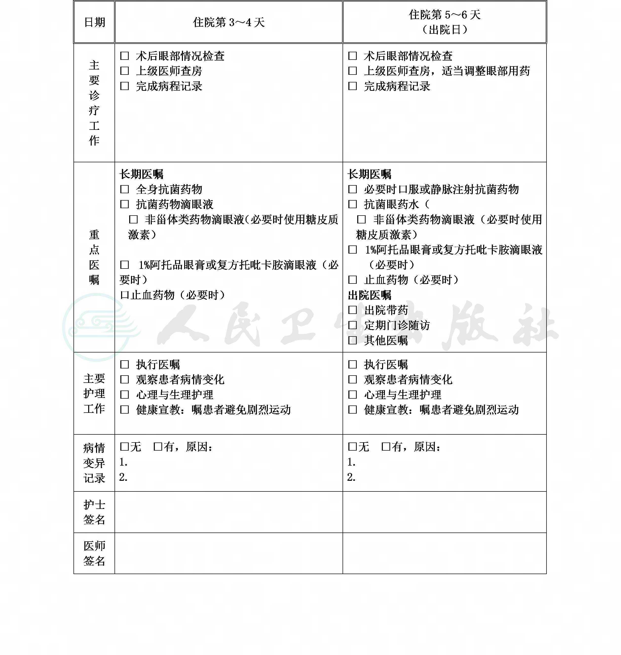 3.若眼部CT显示有明确球内异物,合并眼内容物脱出、晶体损伤或术后炎症反应进行性加重,有眼内炎趋势,或者需要特殊处理的眼后段损伤或虹膜睫状体损伤,退出此路径,进入相关途径。