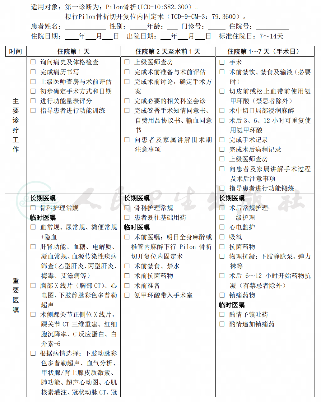 二、Pilon骨折切开复位内固定术加速康复临床路径表单