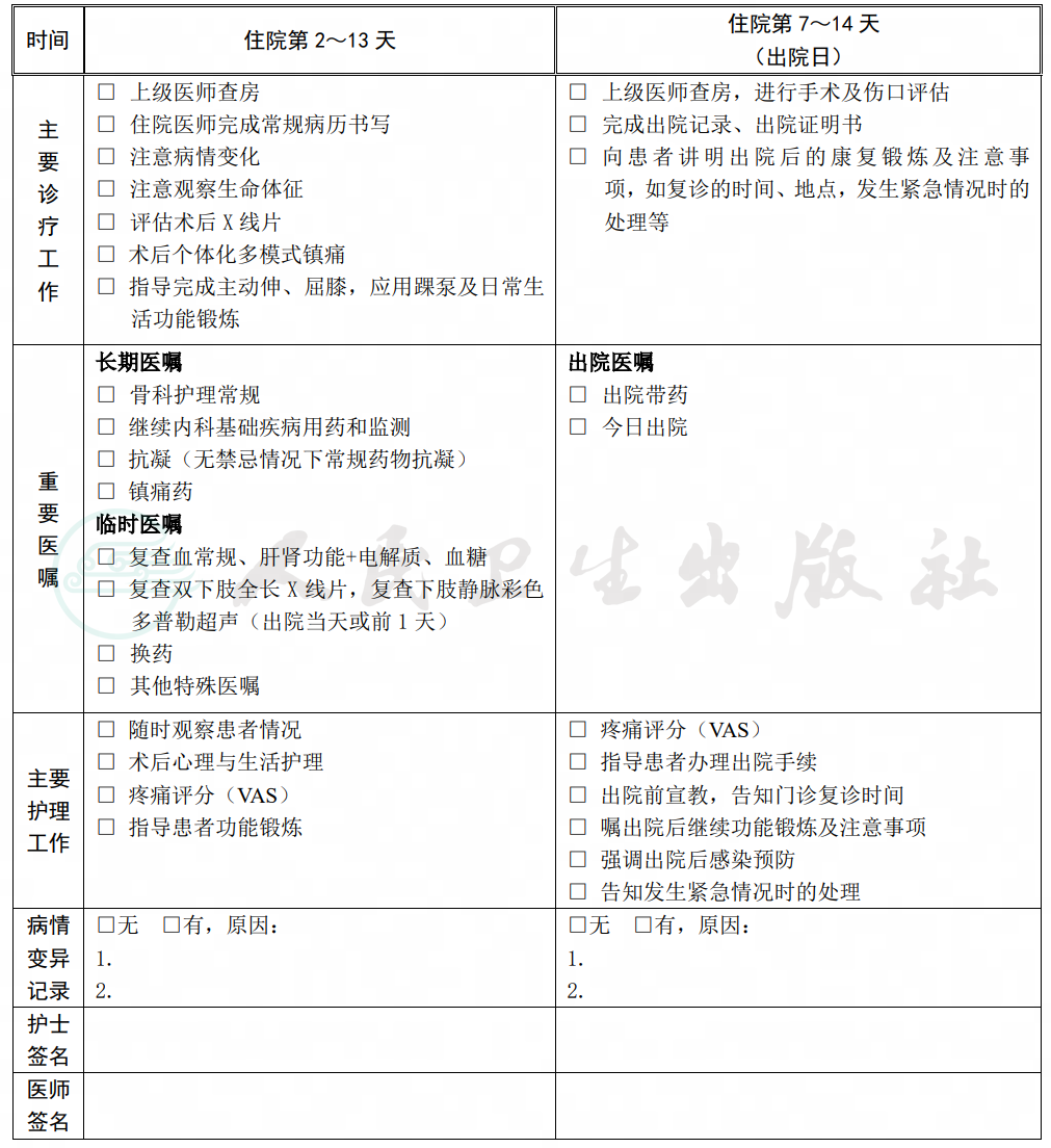 (5)抗凝,预防深静脉血栓/肺栓塞:根据具体情况,参照《骨科大手术加速康复围手术期静脉血栓栓塞症防治专家共识》[中华骨与关节外科杂志,2022,15(10):754-762]执行。