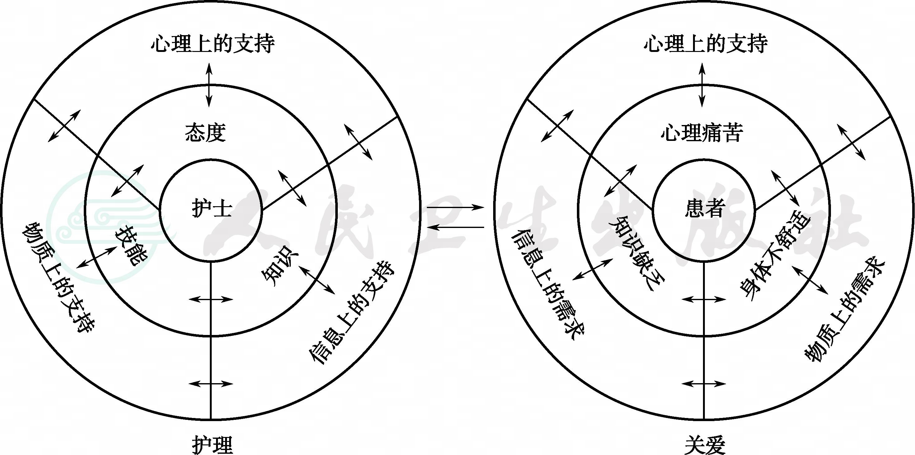 护士向患者传递关爱的过程是一个双向的动态的护患沟通过程。护士评估患者身体上的不舒适、心理上的痛苦和知识上的缺乏,确认患者的身体、心理和信息方面的需求,然后,提供相应的身体、心理和信息方面的支持和帮助,并评价护理措施的效果。这是一个使用护理程序进行护患沟通的过程。