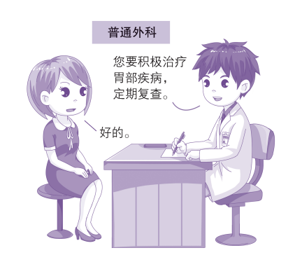 1.立即到医院普通外科就诊,进行检查,例如大便潜血试验、内镜检查、X线钡餐检查等,以此明确诊断,并接受正规治疗。