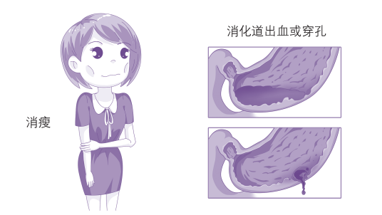 早期:无明显症状或仅有上腹隐痛、嗳气、反酸、食欲缺乏等。进展期,出现上腹部疼痛、食欲缺乏、呕吐或幽门梗阻、消瘦、消化道出血或穿孔等。