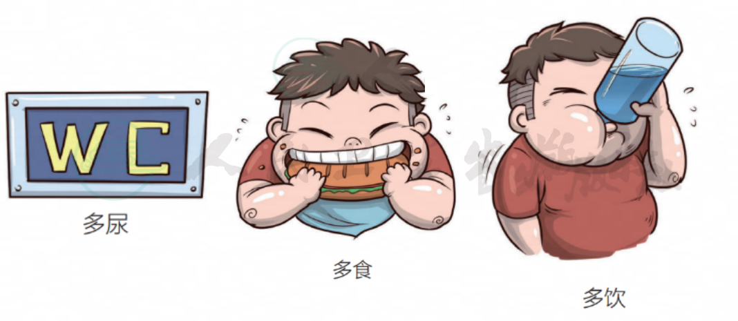 ②多饮:指喝得多。由于多尿,大量体液随尿液流出,所以患者喝水量和次数都成倍增多;