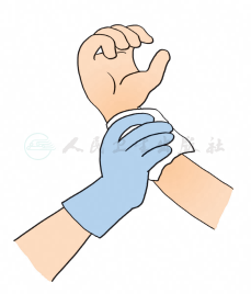 ◆将干净的纱布块或手帕(或其他干净布料)作为敷料覆盖在伤口上,用手直接压迫止血。注意:压迫必须是持续的。