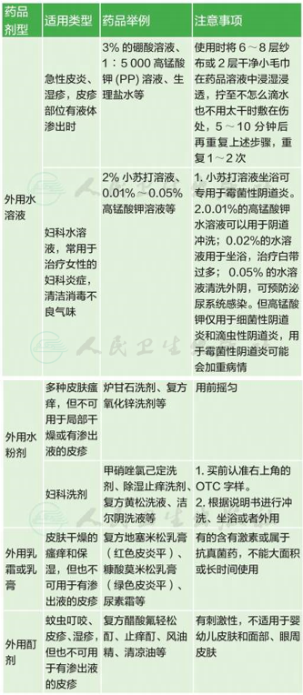 市面上治疗皮肤瘙痒的外用药琳琅满目,有水溶液、软膏剂、乳霜等。我们再用一张表格来给您做个总结,您可以根据家人常见的皮肤瘙痒类型,选购1~2种剂型的外用药品:
