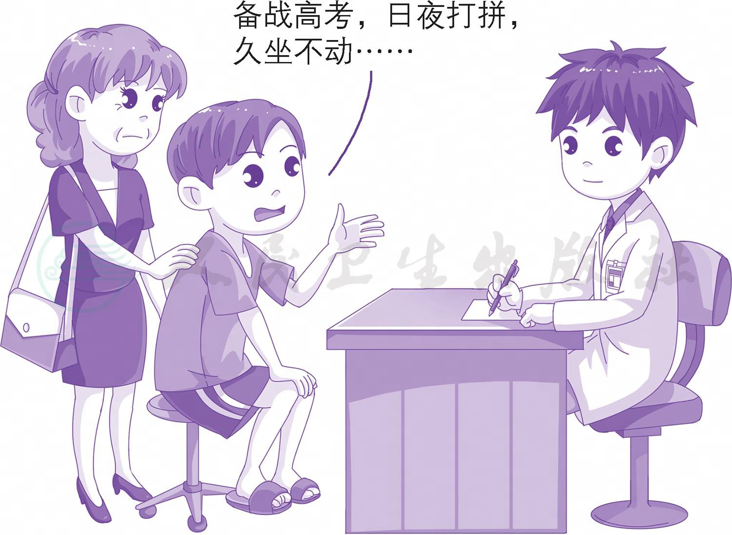 小高是一名高三学生,平时学习非常认真,几乎除了吃饭睡觉就是坐在那里学习,就在高考前夕,痔疮犯了。内服的药吃了,外敷的药也抹了,每天晚上用热水坐浴,就是不见效,而且越来越疼,于是到医院就诊。医生检查后说:“你的痔疮很严重,很疼吧。”高同学连连点头:“有血、有泪,简直一部血泪史啊!”