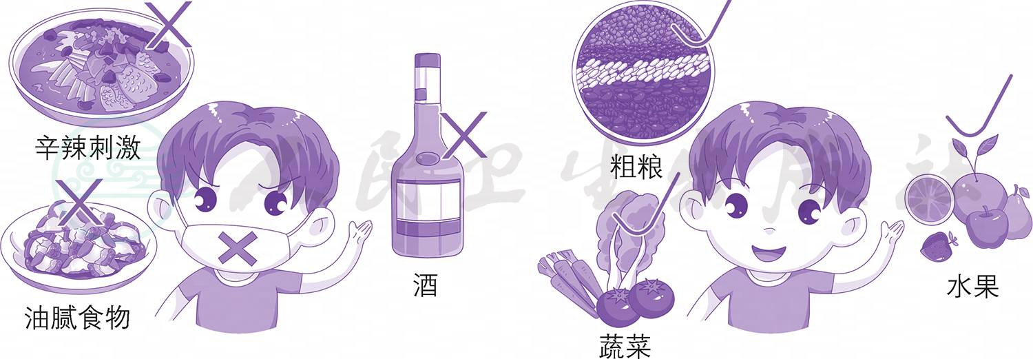 少食辛辣刺激、油腻食物,多吃粗粮、富含纤维的水果蔬菜,避免大量饮酒。