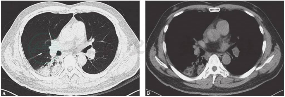 男性患者,49岁,因“咳嗽、胸痛、咯血10余天,发热、气喘1周”入院。患者于10余天前无明显诱因开始出现咳嗽、胸痛(为持续性牵拉痛,以左侧为甚,无放射痛,与呼吸无明显关联)伴咯血(以痰中带血丝为主),无恶心、呕吐、气喘,在当地医院进行对症治疗(具体不详),但症状无明显好转。1周前,患者开始出现发热,初为低热(最高体温37.8℃),伴活动后气喘,体力明显下降,无腹胀、腹泻、全身皮疹、头晕、头痛等,于县医院住院,诊断为“支气管扩张合并咯血”。经止血、抗感染及对症治疗后,患者胸痛症状稍好转,但咯血量较前增多,活动后气喘较前加重,且体温达39.8℃,遂转我院进一步诊治。起病以来,患者精神、饮食、睡眠一般,大小便尚可,体力、体重下降。