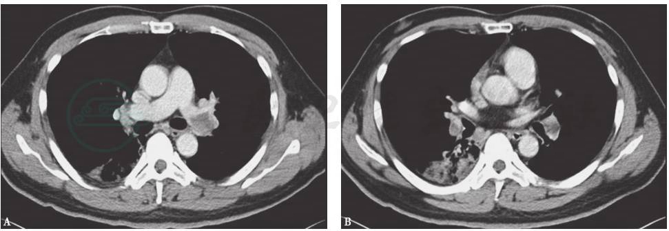 (2)肺栓塞常是静脉血栓形成的合并症,栓子通常来源于下肢和骨盆的深静脉,通过循环到肺动脉引起栓塞。对于没有合并下肢深静脉血栓的患者,更容易漏诊和误诊。
