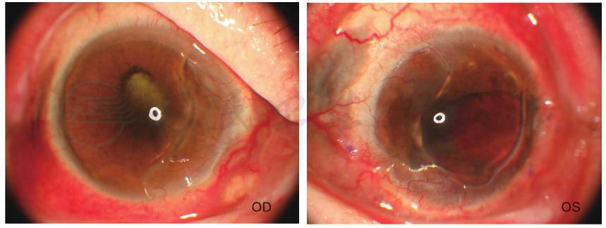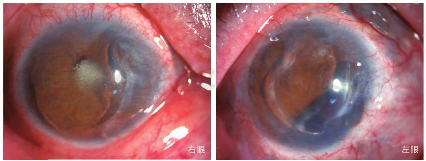 右眼结膜充血、巩膜变薄,并且发现4点及8点区肿物,角膜鼻侧融解,基质变薄,角膜新生血管(corneal neovascularization,CNV)存在,前房中深,瞳孔不圆,虹膜后粘连,晶状体混浊,眼底未及;左眼结膜充血,巩膜大范围变薄,可见巩膜缝线,角膜近全周融解,周围新生血管长入,瞳孔区血性机化膜,隐见IOL,眼底窥不入。