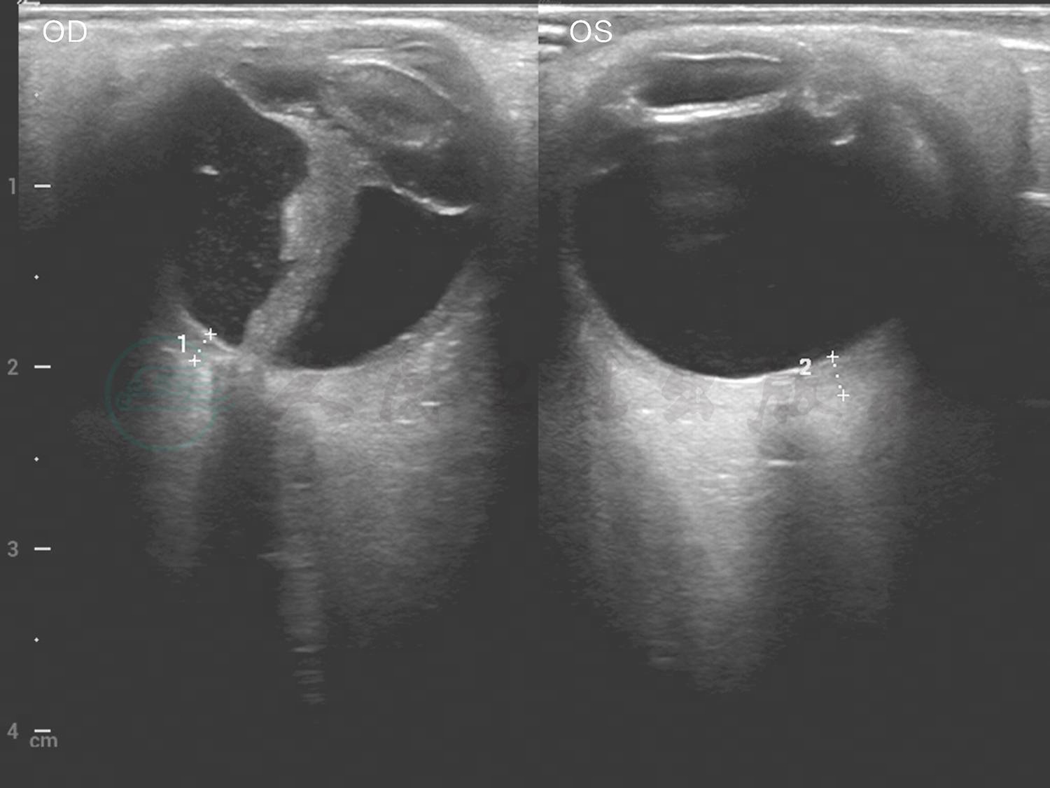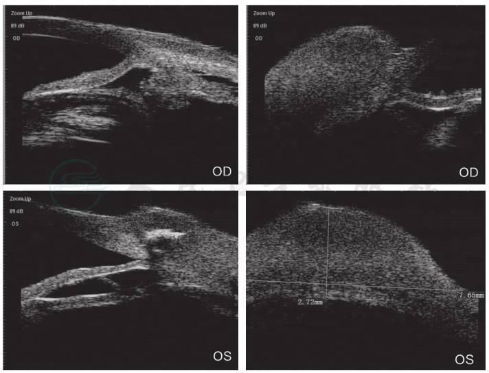 图3 患者门诊就诊时(2020年4月16日)UBM检查见双眼中低回声巩膜隆起
